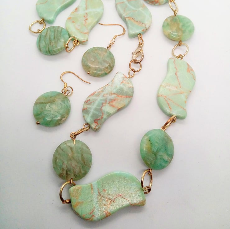 Wavy Turquoise Beads & Jasper Discs Beaded Necklace and Earrings Set