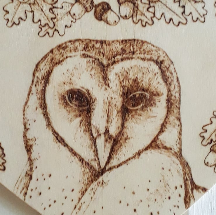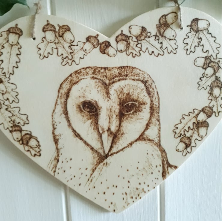 Wooden heart illustrated with a barn owl surrounded with acorns & oak leaves using pyrography (wood burning).