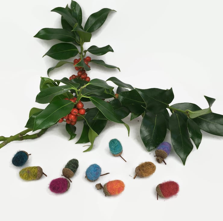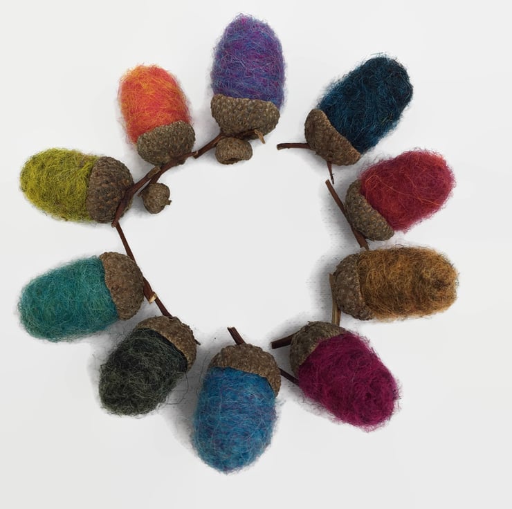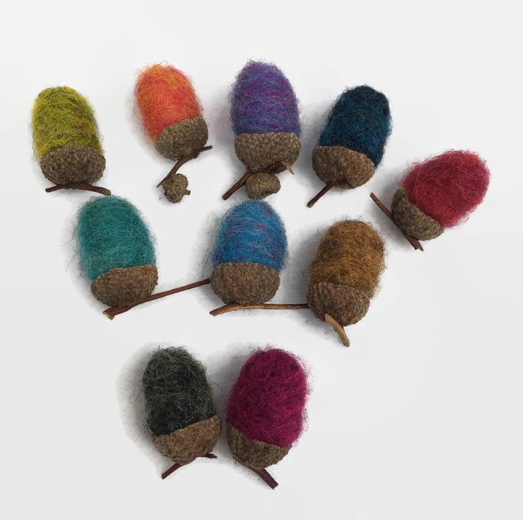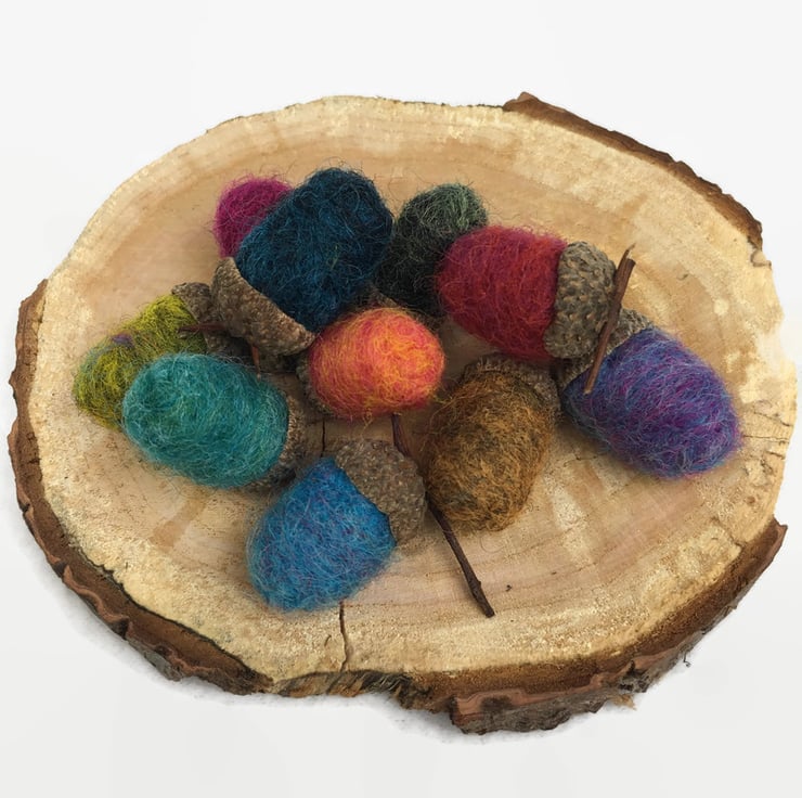 Brightly coloured needle felted acorns to provide a splash of colour to your home. These needle felted "acorns" have been made using brightly coloured woollen fibres which have been needle felted into a small acorn and glued into an acorn cap. The acorns will provide a beautiful accent to your home decor, Beautiful scattered across the mantlepiece or table, piled up or placed in a dish. The acorn caps have been scavenged from beneath a local oak tree and have been cleaned, dried and sterilised prior to use so as to provide long-lasting decoration. The acorns in this listing will arrive as individual acorns, if you prefer acorns attached to a stalk (as shown in the final photo) please see the alternative listing in my shop.