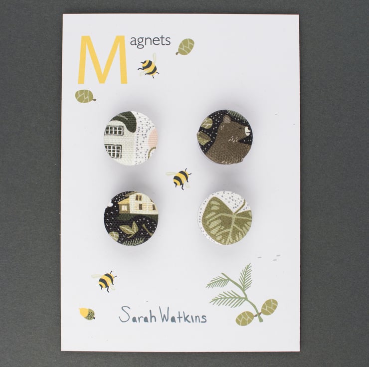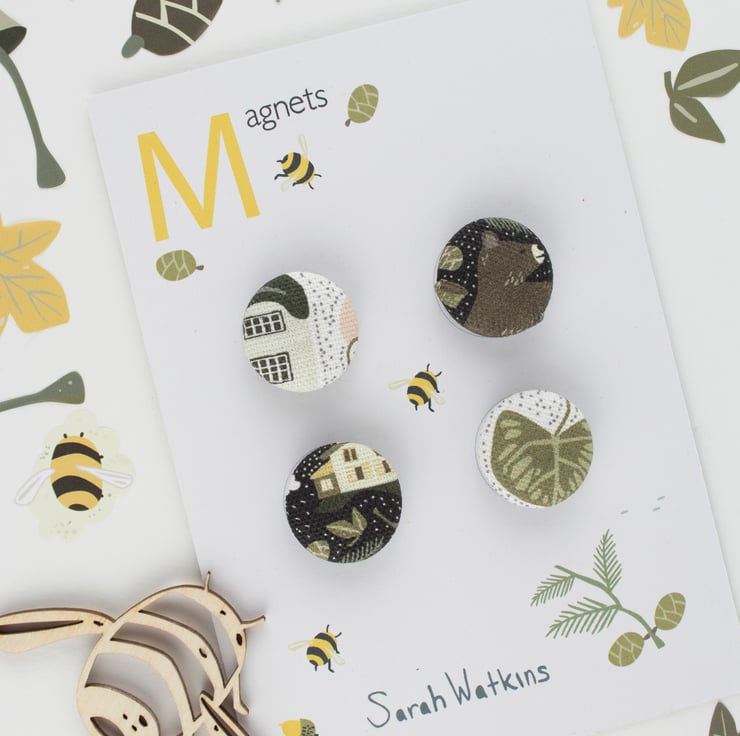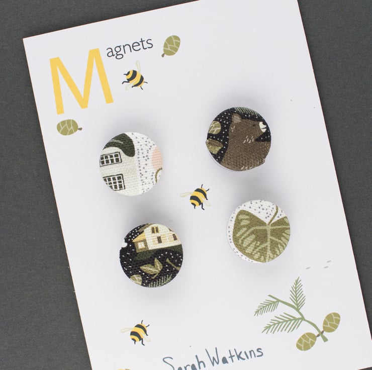 4 individual and unique magnets, featuring a bear and details from our own fabrics. Each fabric magnet is mounted onto a woodland illustrated card. The magnets are great for holding notes on fridges. Every magnet is handmade by us in Yorkshire.