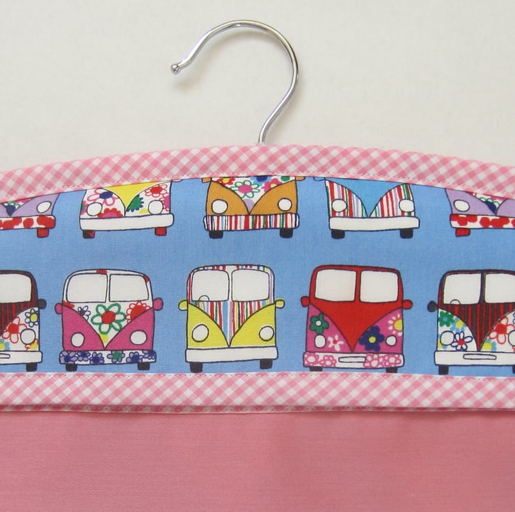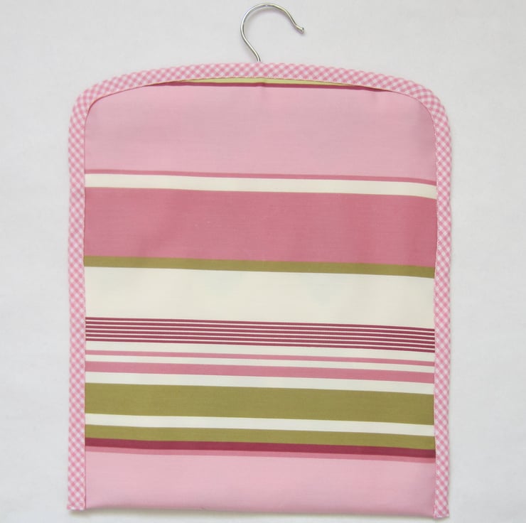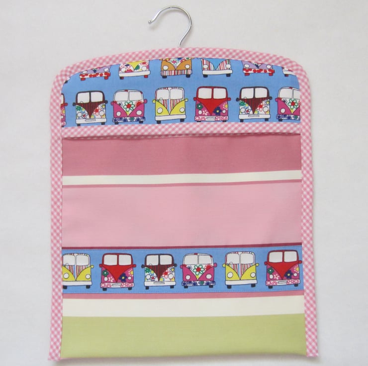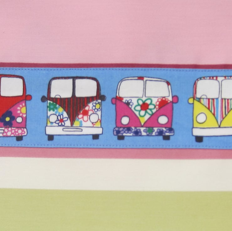This sturdy and fun peg bag is made with pink,cream and green striped fabric with camper van top and bottom panels.