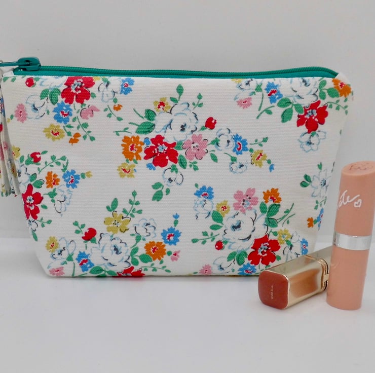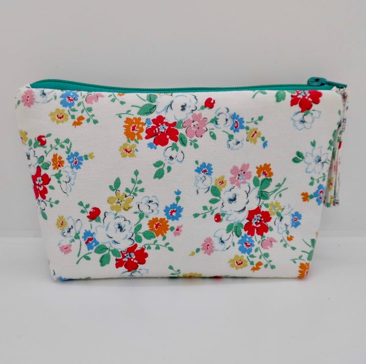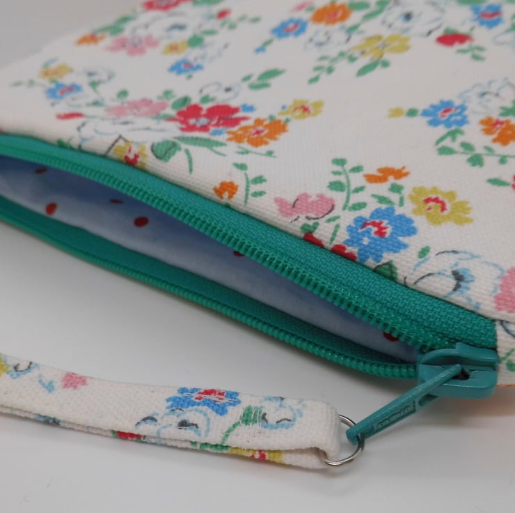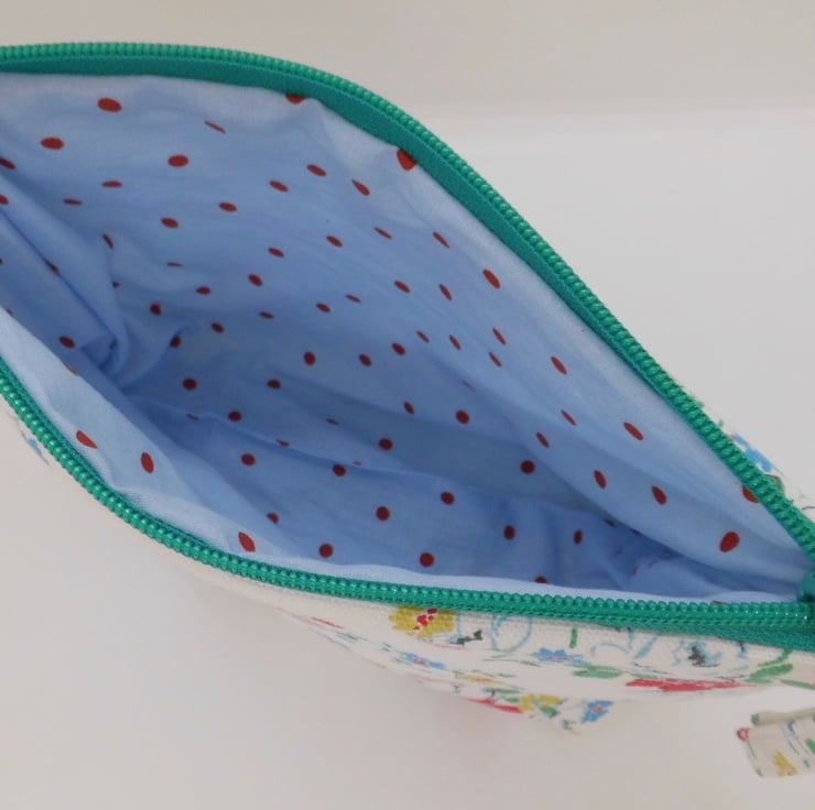 This zipped make up bag is made using a very pretty Cath Kidston floral fabric. It is lined with blue and red spot cotton fabric. Outer fabric has been backed with fusible interfacing to give it some body and maintain shape. There is a green zip across the top, finished with a fabric pull.
