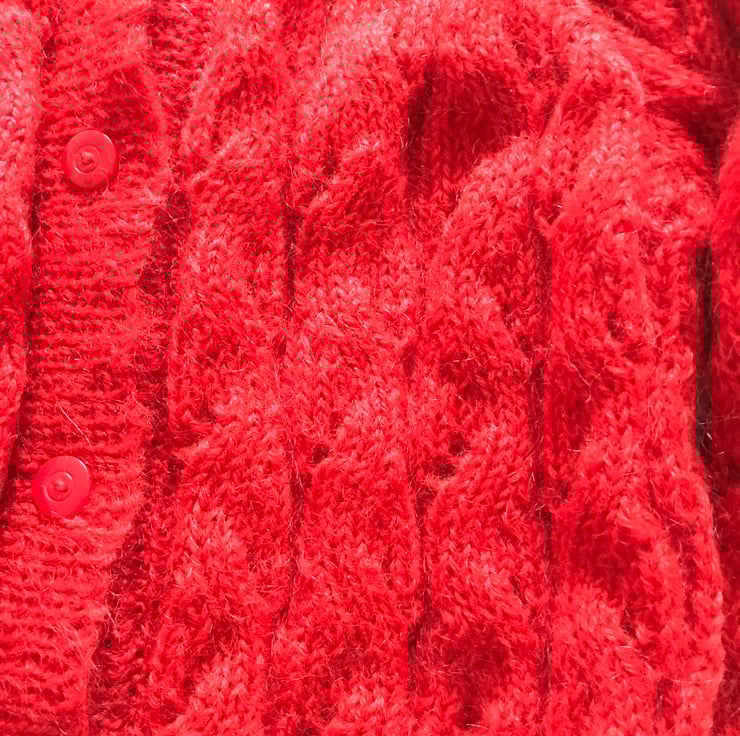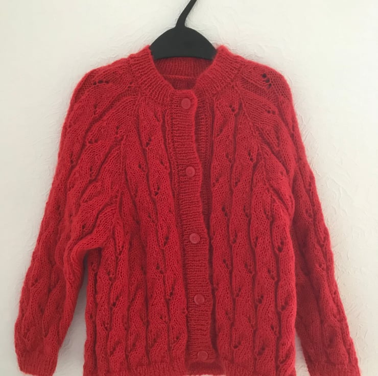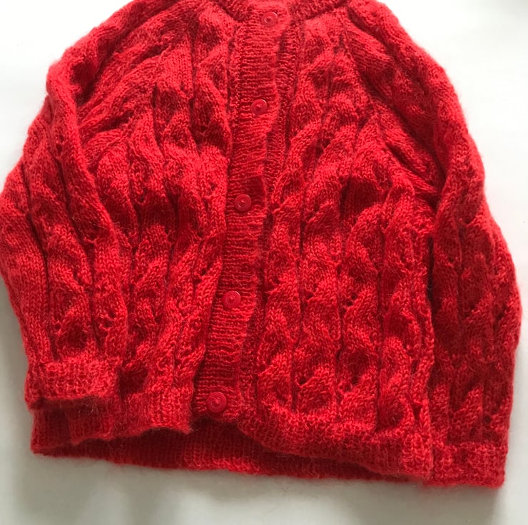 A cabled cardigan knit in a vintage yarn from a vintage pattern. The cardigan has cables all over giving it a lovely texture. The yarn has mohair in it which gives it a slightly fluffy look and is very soft. The pattern size is 3 years but children vary in size so actual measurements are given