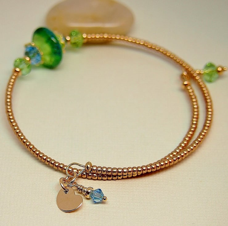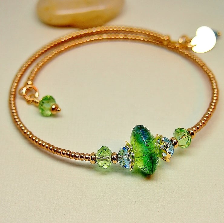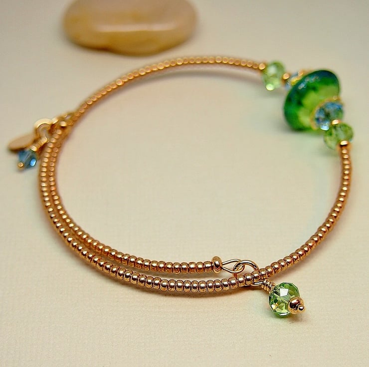 I have complimented the central bead with Swarovski crystal rondelles in green and blue, gold filled beads and bead caps, and Champagne Gold Miyuki seed beads. Bracelet is finished with co-ordinationg charms.