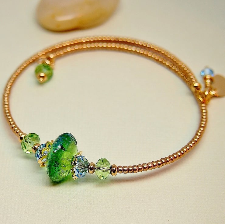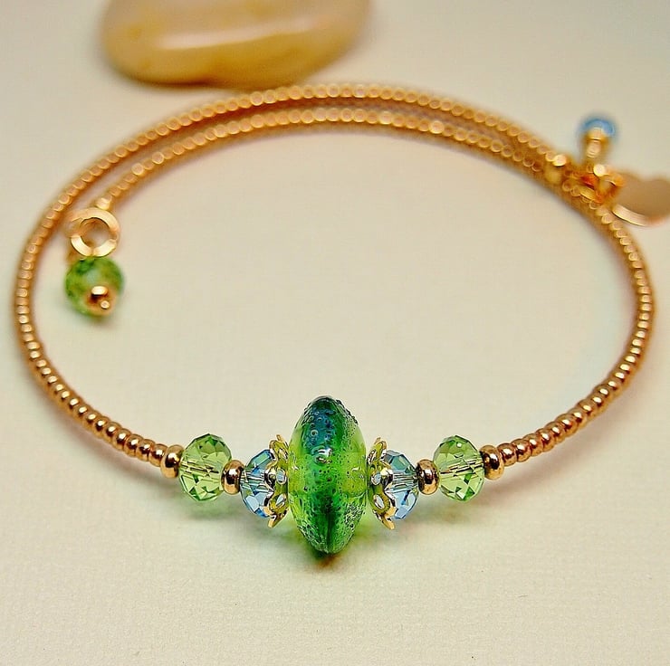 Beaded memory wire bracelet featuring a beautiful artisan made green blue lampwork glass bead as it's focal point. This bead is made of green glass with surface detail in silvered glass giving a blue/green sheen.