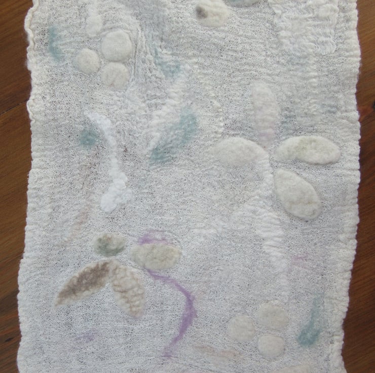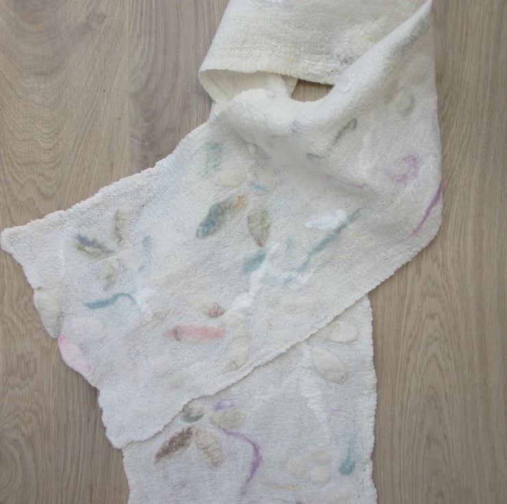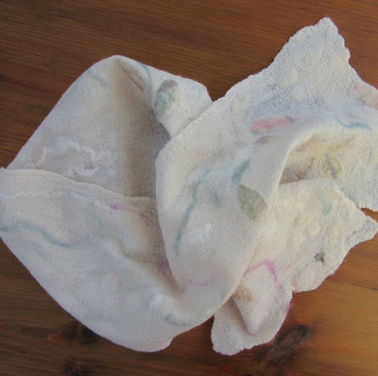 Light,delicate and pretty cotton and merino wool scarf. A very fine layer of merino wool has been felted onto cream cotton muslin. The surface has then been decorated with pieces of silk and abstract flower and leaf felt shapes which have then been felted into the surface. Splashes of pale pink, turquoise and beige add a hint of colour.
