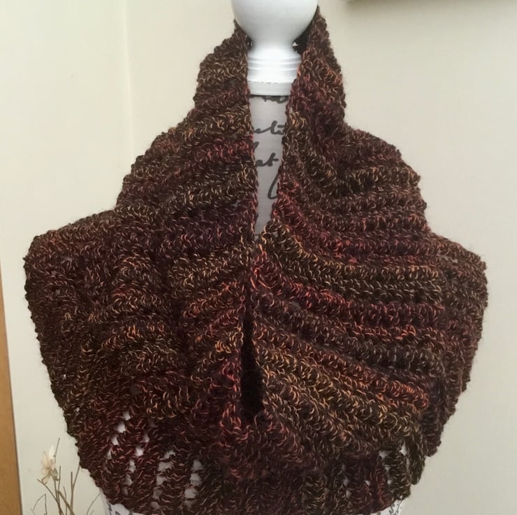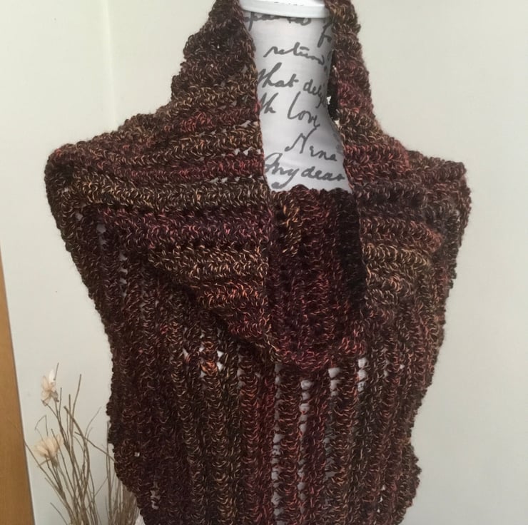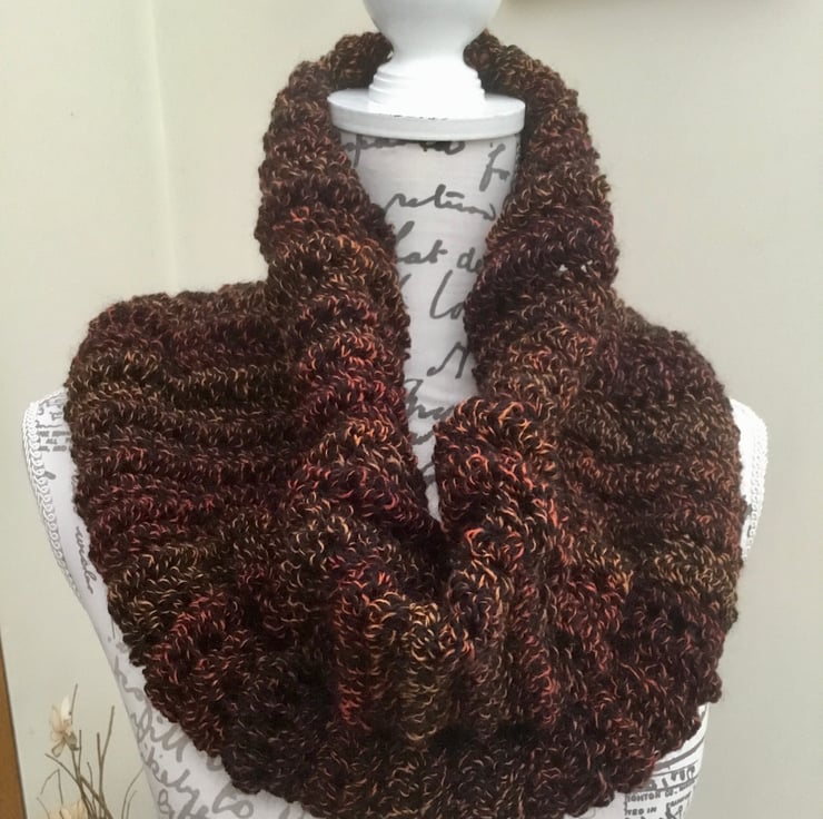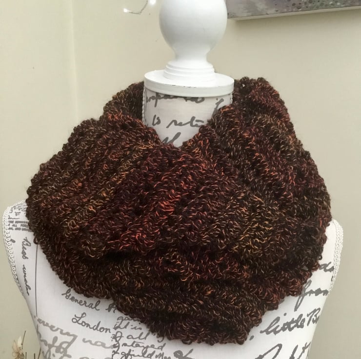 Autumn Tones! A Classic and sophisticated deep brown, russet and orange autumn Tones crocheted Cowl, neck muff or snood, perfect for keeping warm and stylish! Triple Crocheted in the very pretty Denys Brunton Designer Yarn.