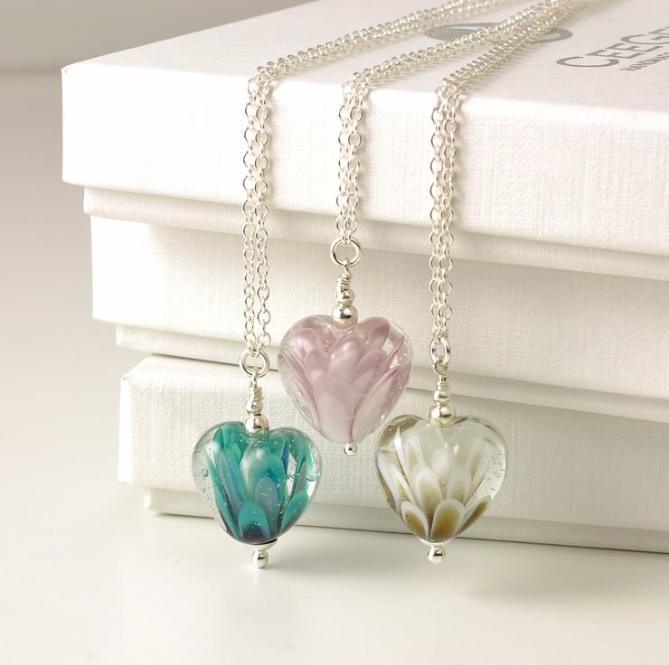 A mini version of my popular petal heart necklace, these beautiful little pendants feature coloured glass petals arching up through a clear glass heart. Handmade by stretching a series of teeny glass dots up through the heart, the glass is kiln annealed for durability. Hung on a choice of sterling silver chain, and available in 3 colours.
