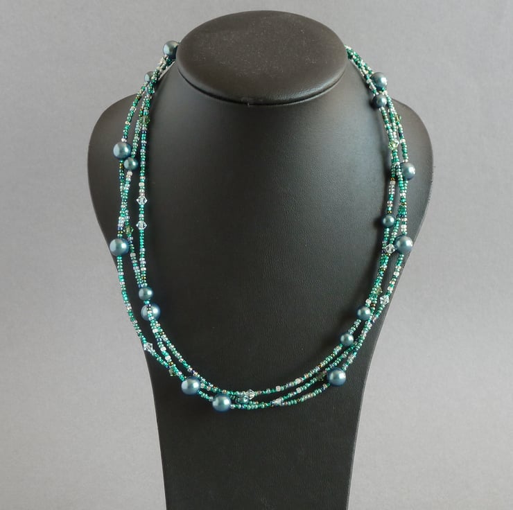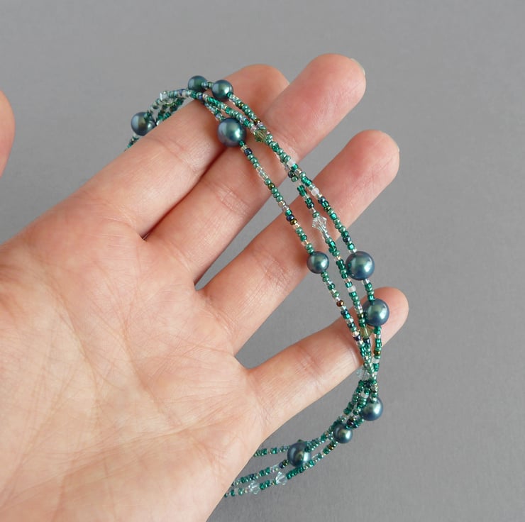 I have used dark green glass pearls, sparkling crystals and multi-toned Czech glass seed beads to create this dark green three strand necklace. Colours featured in this necklace include peacock green, teal, navy and frosted white. Unlike many multi-strand necklaces, this pearl necklace is braided to ensure the strands sit nicely when worn. This twisted necklace would be the ideal gift for women who love colourful jewellery.