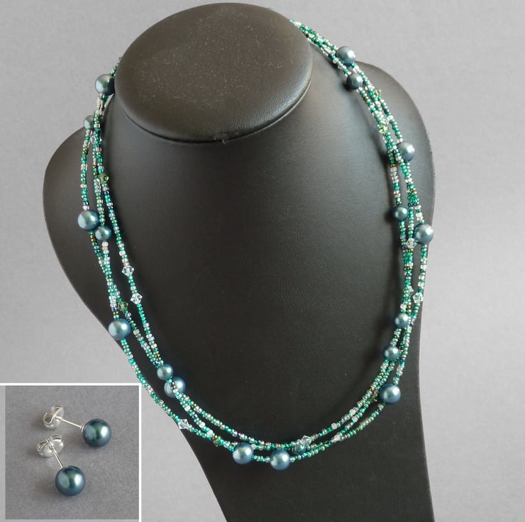 Dark Green Multi-strand Necklace - Emerald Three Strand Pearl Jewellery - Gifts