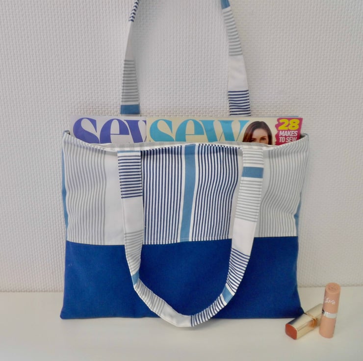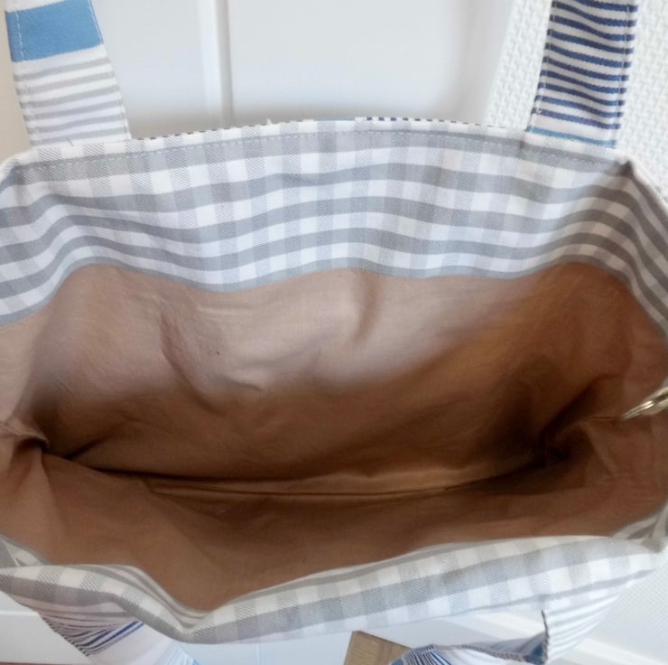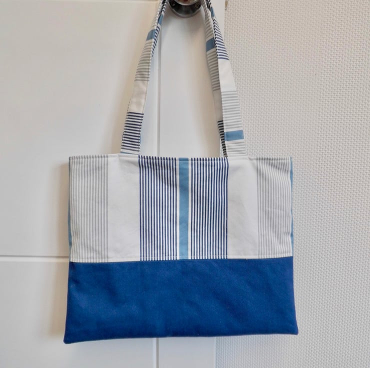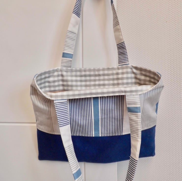 Handles are blue and white striped and the loop of each handle measures about 57cm, so can be used over the shoulder if needed. Neatly topstitched with white thread.