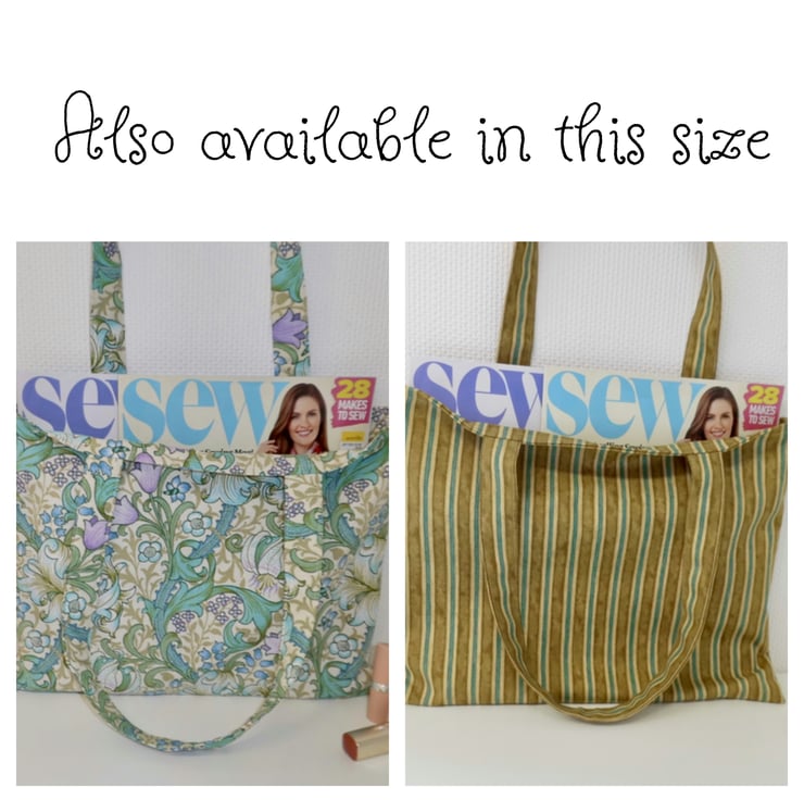 I have made this one to slightly different measurements than usual for those who find shoulder totes can be too long when they hold it by the handles. It is wider than it is long, the measurements are 38cm x 29cm.