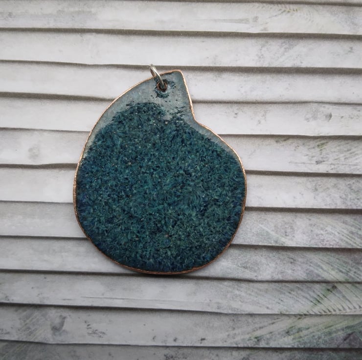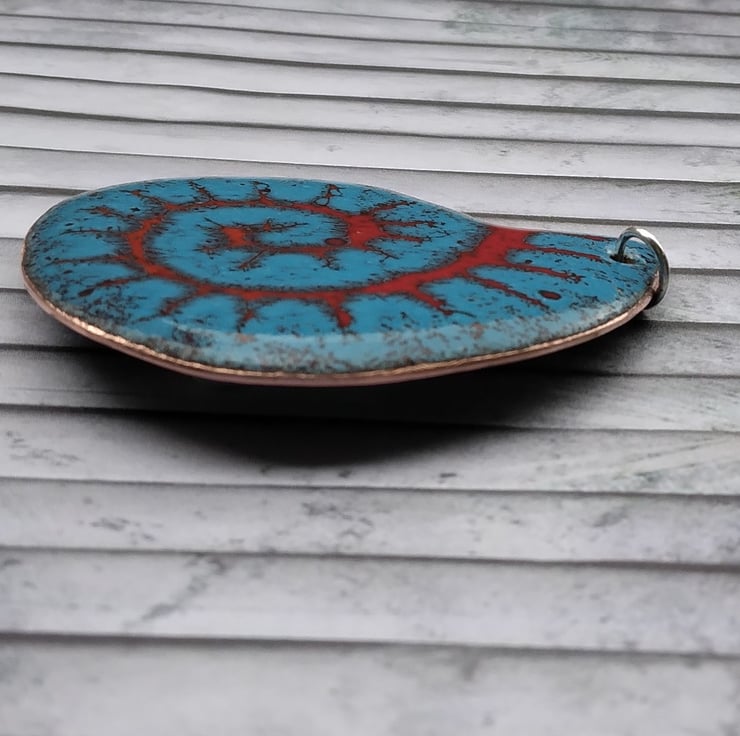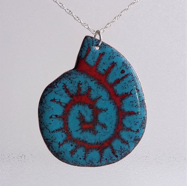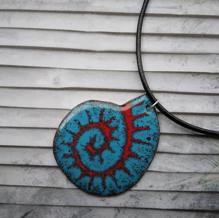 Large, hand-cut, ammonite-shaped pendant with rounded edges on recycled copper, enamelled in red, orange and teal. The pendant has been kiln-fired and measures approximately 47mm from top to bottom, and 40mm across the widest part. To complete the piece aesthetically and for a smooth finish against the skin, the back has been given two coats of dark blue tweed-effect enamel.It comes complete with a soldered sterling silver jump ring (6mm) and is supplied with a little organza pouch. An 18” sterling silver rope chain, or a 2mm leather cord (selection of lengths) finished with a magnetic clasp, can be purchased separately from my shop if needed – please see separate listings. If you are using your own chain, please ensure that it will fit through the 6mm jump ring, allowing for the thickness of the pendant.