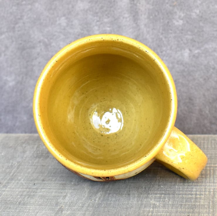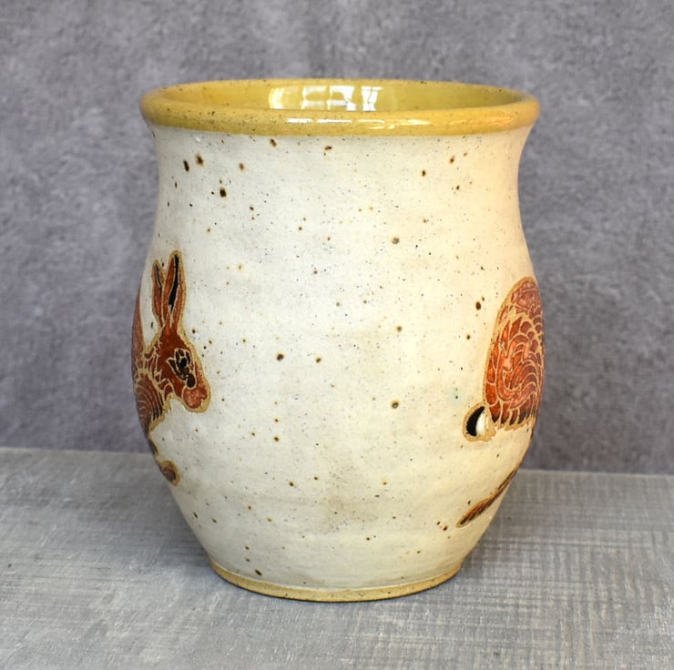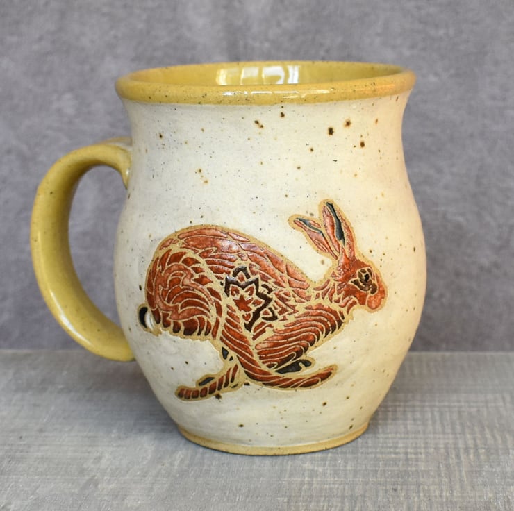 A hand thrown stoneware pottery mug with an image of a running hare on each side. This mug is 11cm tall with a stencilled image on each side. The rest of the outside of the mug is glazed with a speckled matte glaze, with the inside in a gloss yellow glaze to make it easy to clean.