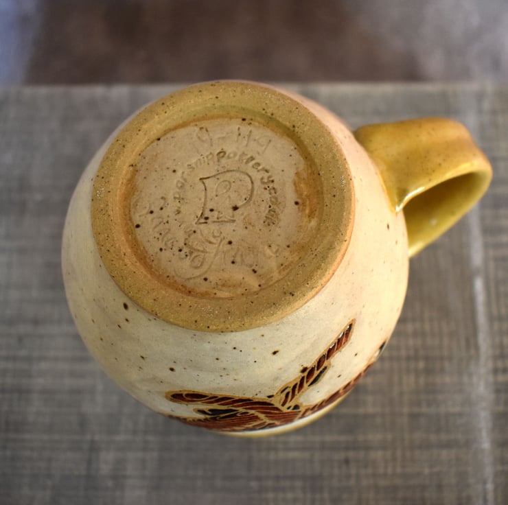 The picture was drawn by Annette and from this drawing two adhesive stencils were made, one for each side of the mug. The stencils were eased into place onto the curve of the pot and three coats of glaze painted into the outlines. When the stencils are removed they leave the outline in the natural colour of the fired clay.