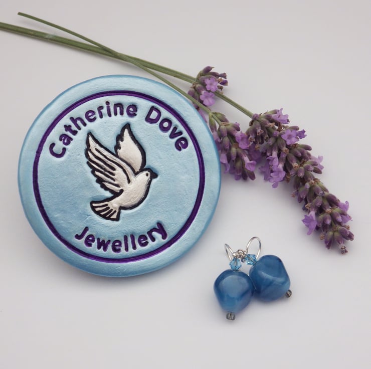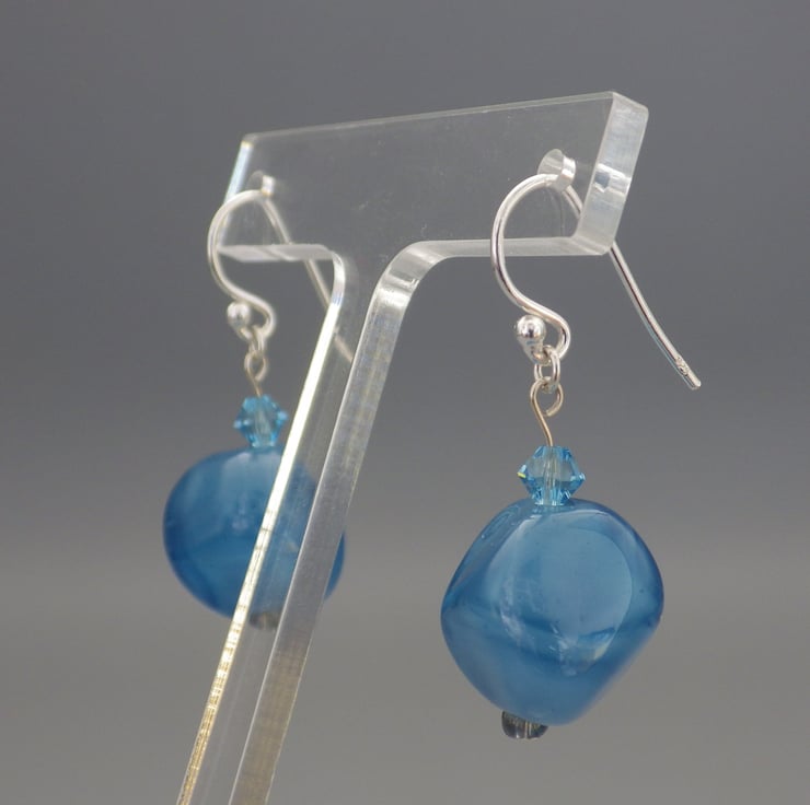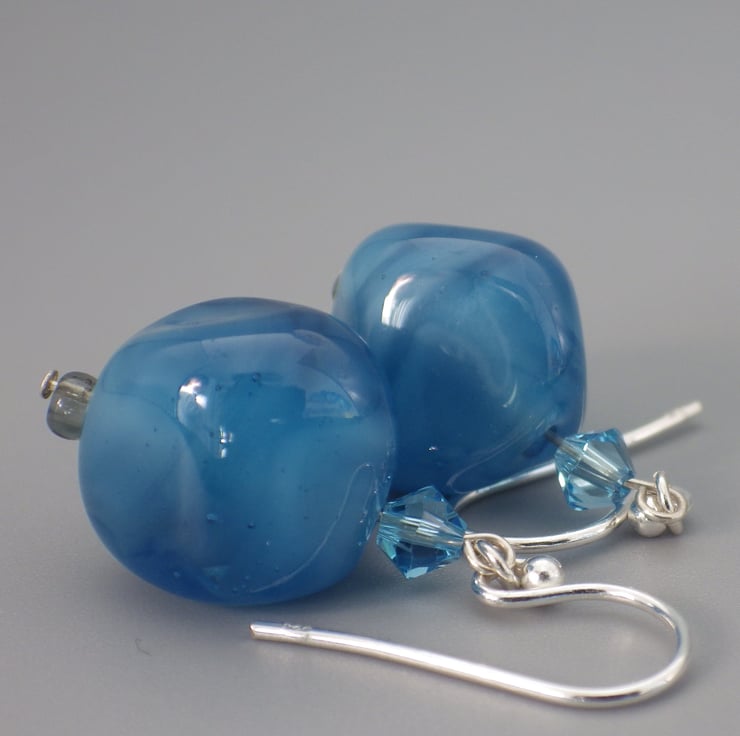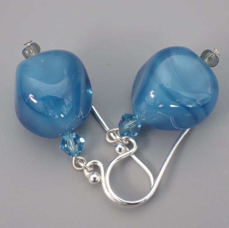 These earrings feature a lampwork bead in an irregular nugget shape, made using a wonderful mid blue glass. The glass has a wonderful smoky appearance to create a fascinating bead. Teamed with fabulous Swarovski bicones in their aquamarine shade and with simple grey seed beads, they are finished using Sterling Silver findings to form eye catching earrings.