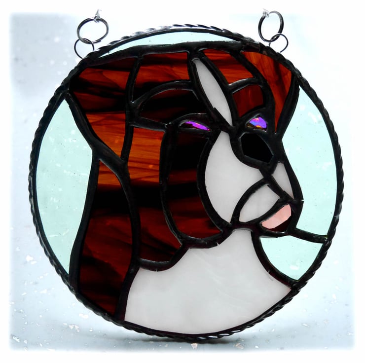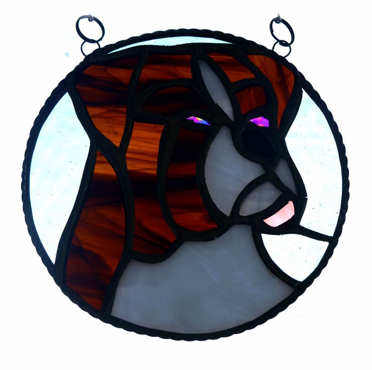 This is a stained glass suncatcher made using the Tiffany copper foil technique.
