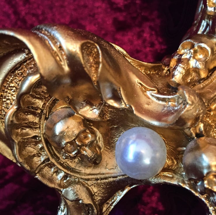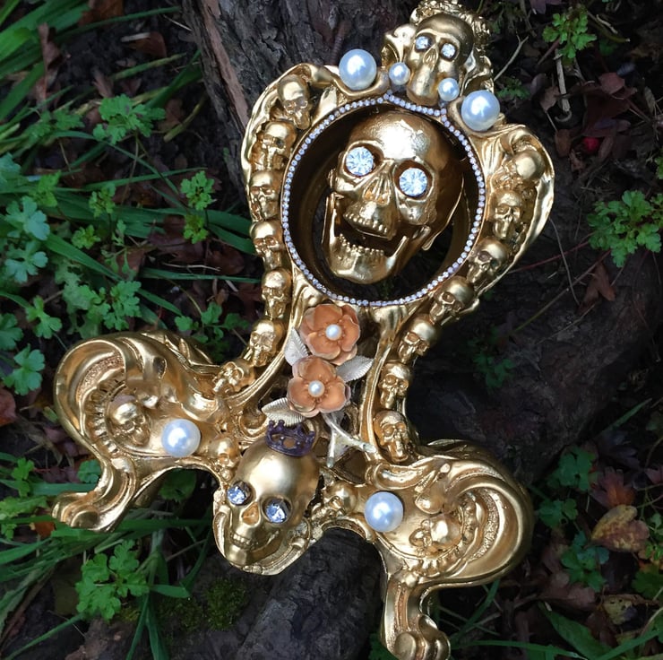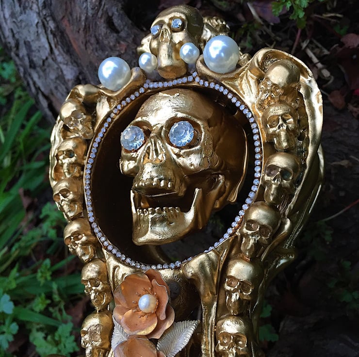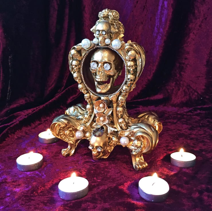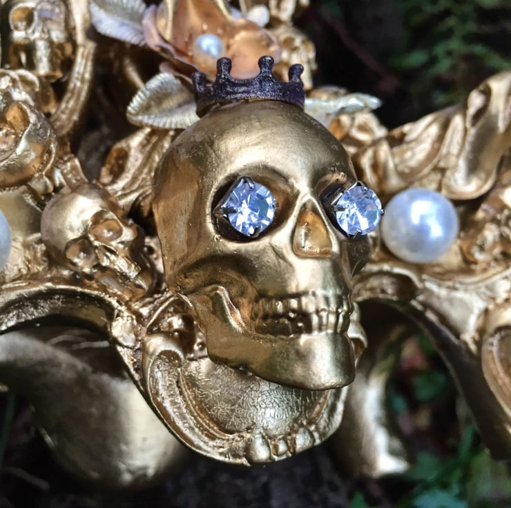 A unique, handmade memento mori sculpture that is adorned with golden skulls