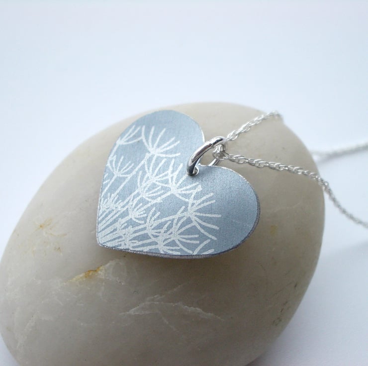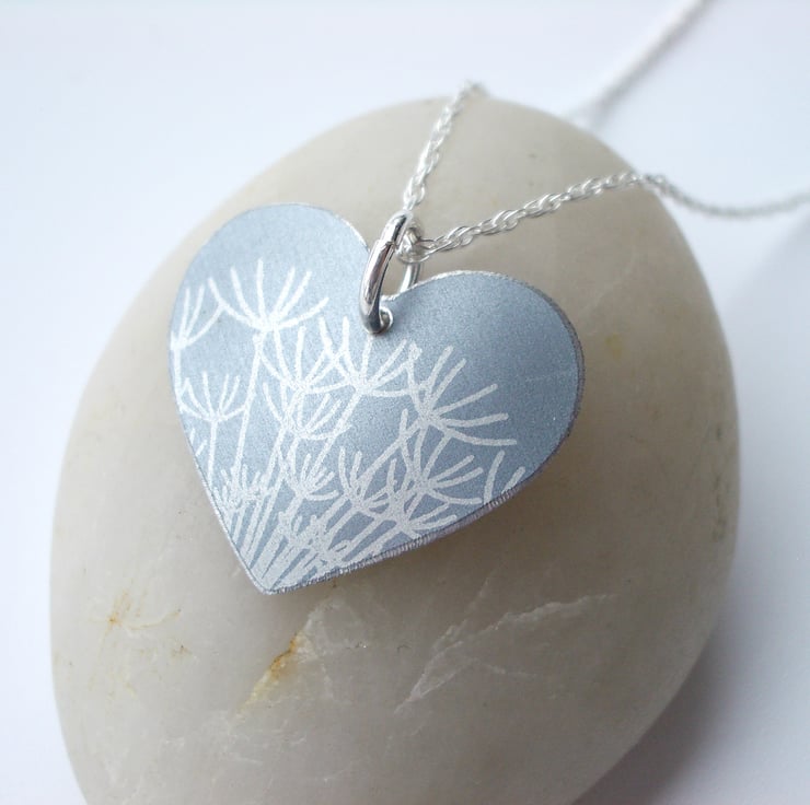 This simple pendant is hand made from aluminium which I have dyed a in a soft silver grey and printed with a pretty dandelion seed heads design. I saw pierce by hand the heart shape and dome it so that it catches the light.