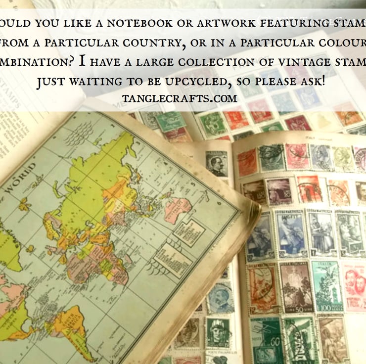 I spend hours browsing through old stamp albums to find just the right stamps for my abstract collage art. The albums often have just as much character as the stamps themselves, and the cover of this diary is inspired by the old grid-style pages (from the time before larger commemorative stamps became commonplace). A great excuse to showcase some of my favourite collections of definitive stamps!.
