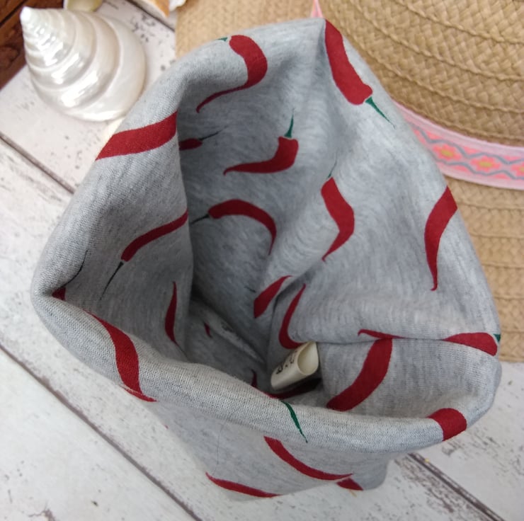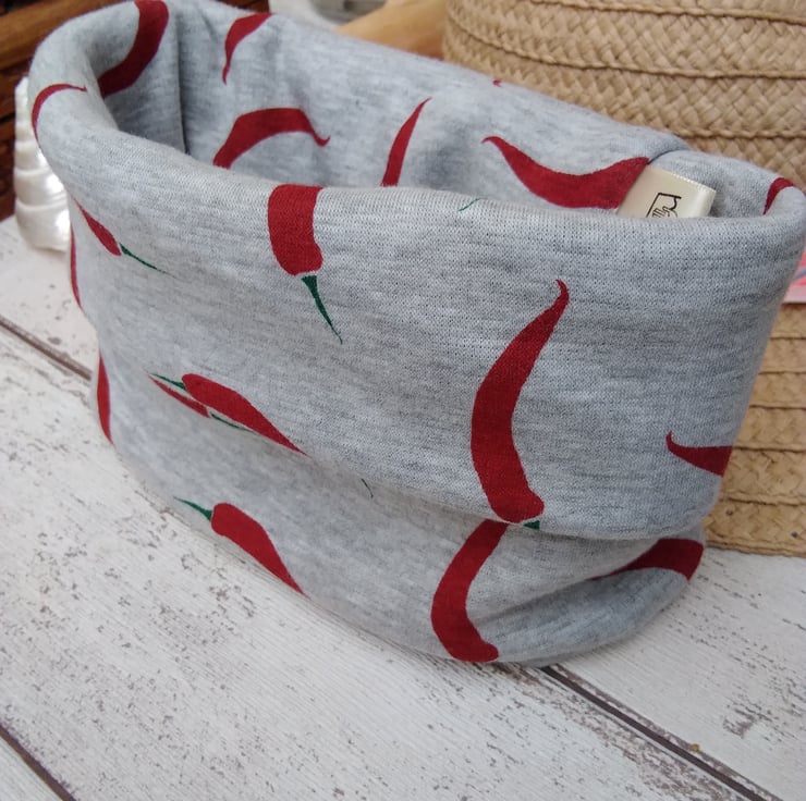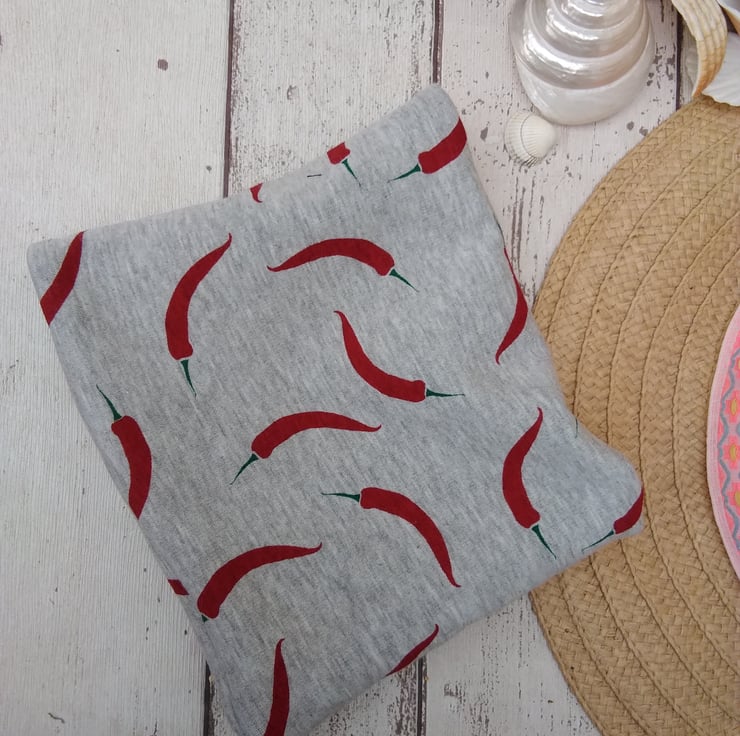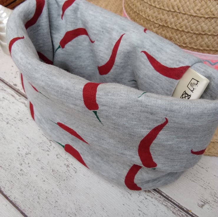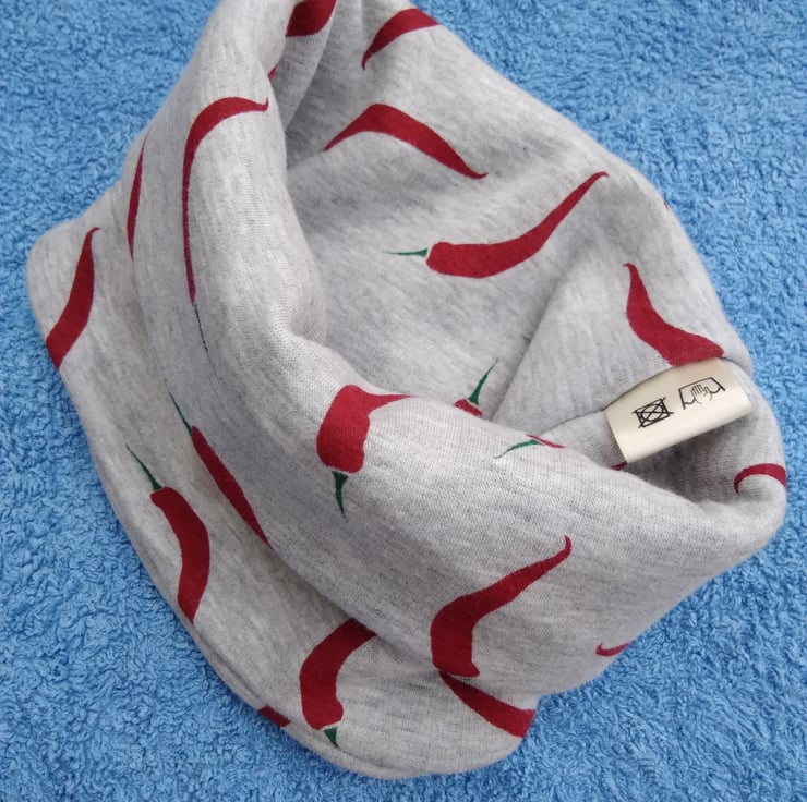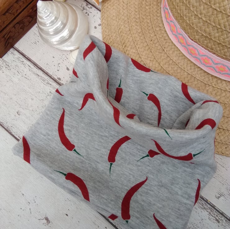 A fun dog snood with a chilies design. In light grey. Fabric is jersey fleece backed, so very warm. Easy to pop over your dogs head. Be the envy of your dog friends. Practical and fun. Especially if your furry friend feels the cold.