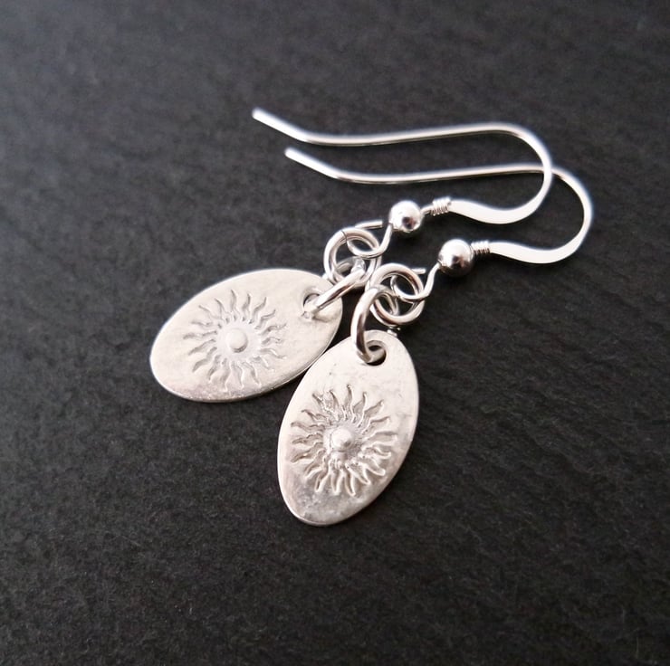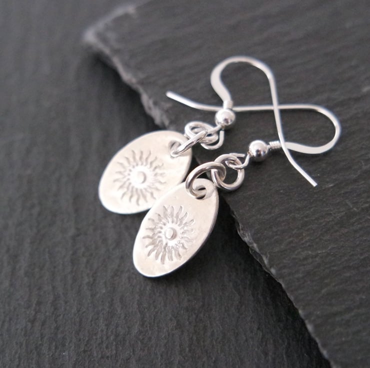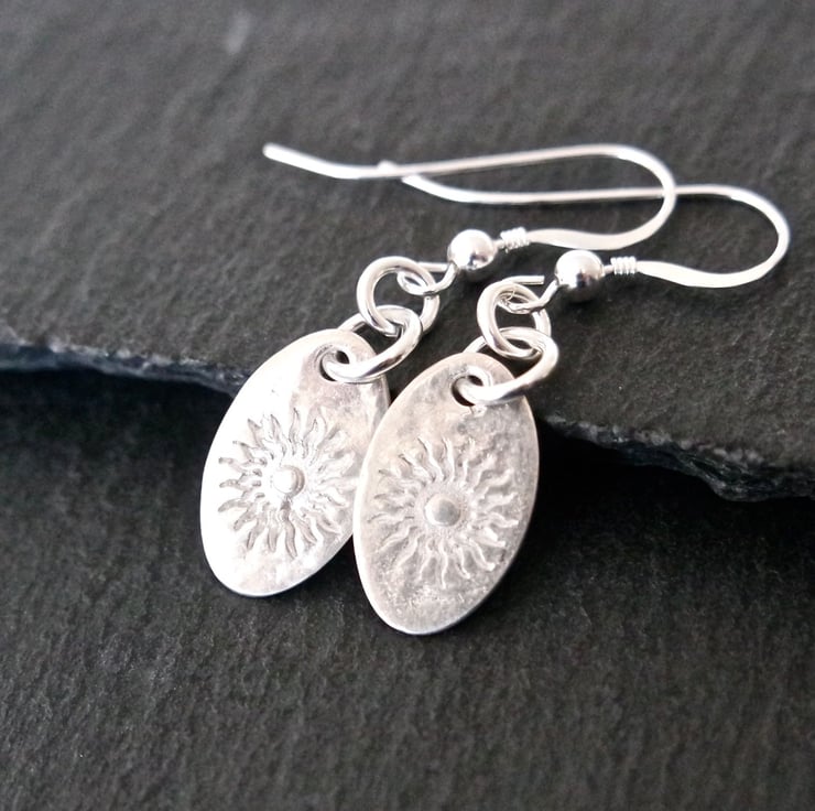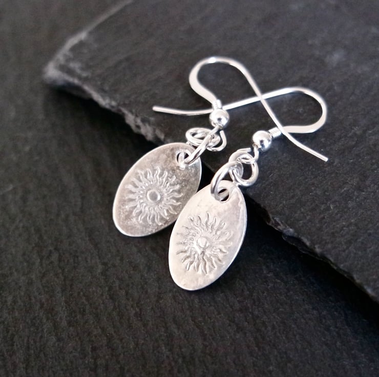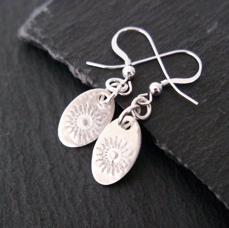 A beautiful pair of fine silver earrings with oval charms with a wavy sun pattern.