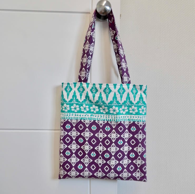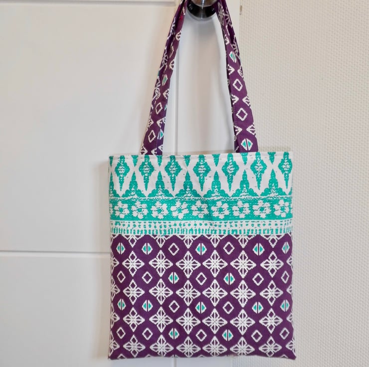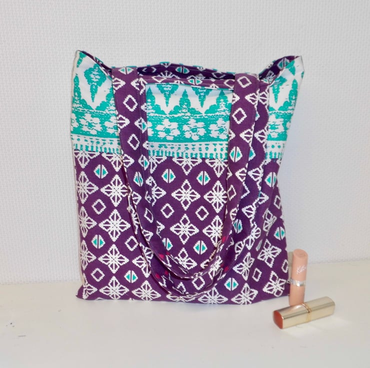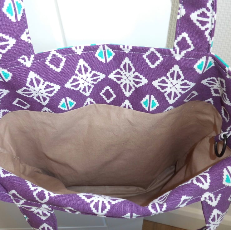 A basic tote bag made using a purple and green medium weight cotton fabric from Ikea. It is faced at the top with the same fabric and then lined with beige cotton lining fabric. I have inserted a D ring into one of the seams inside, handy if you want to clip your keys or purse safe inside.