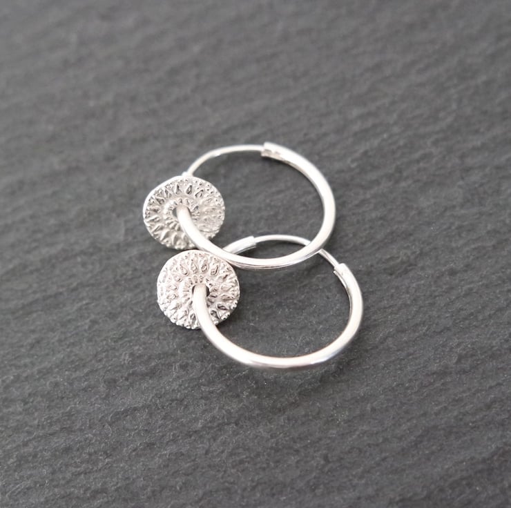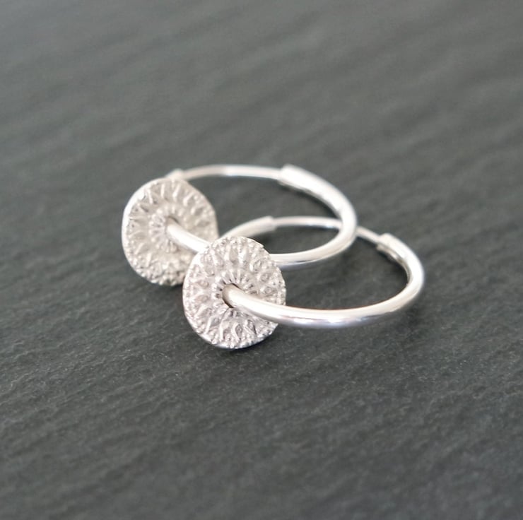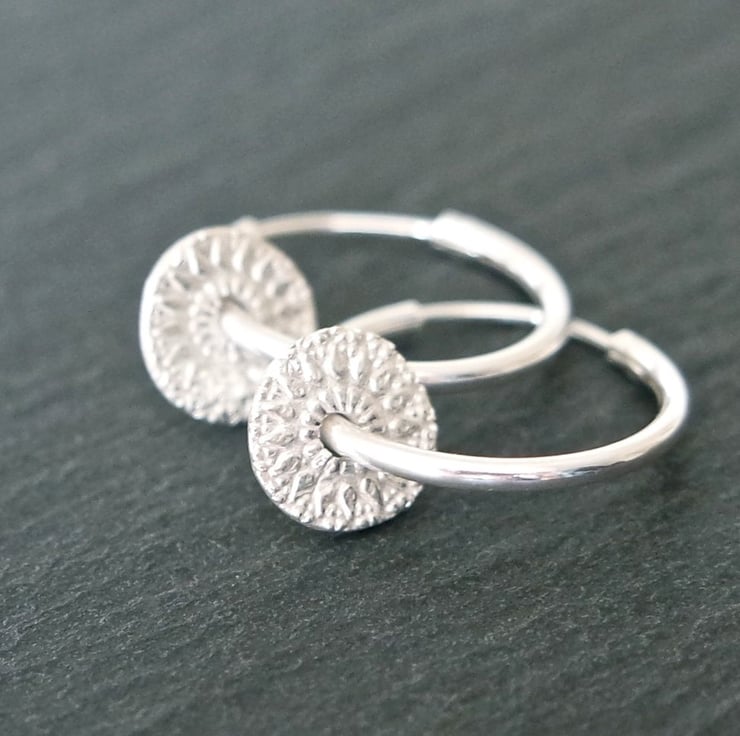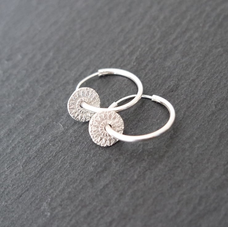 A beautiful pair of small 925 Silver hoops with small mandala rounds made with pure silver clay.