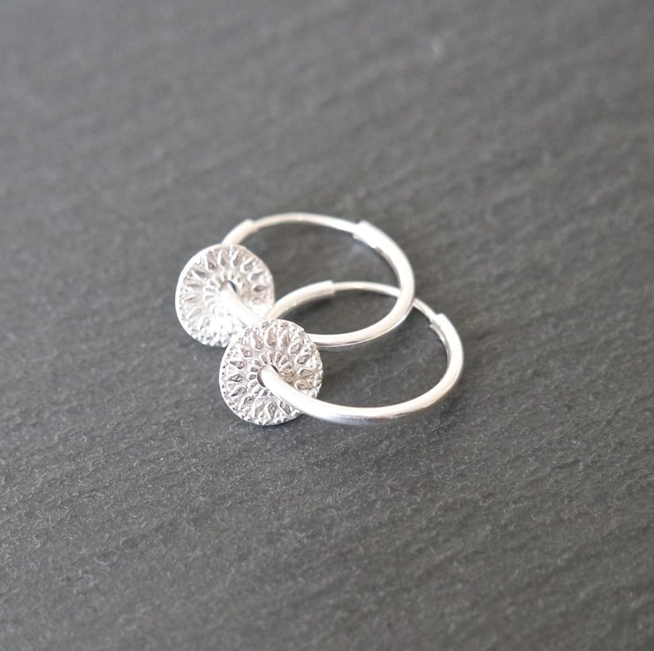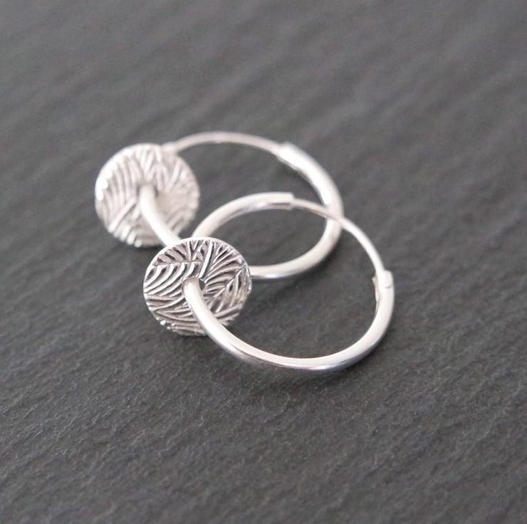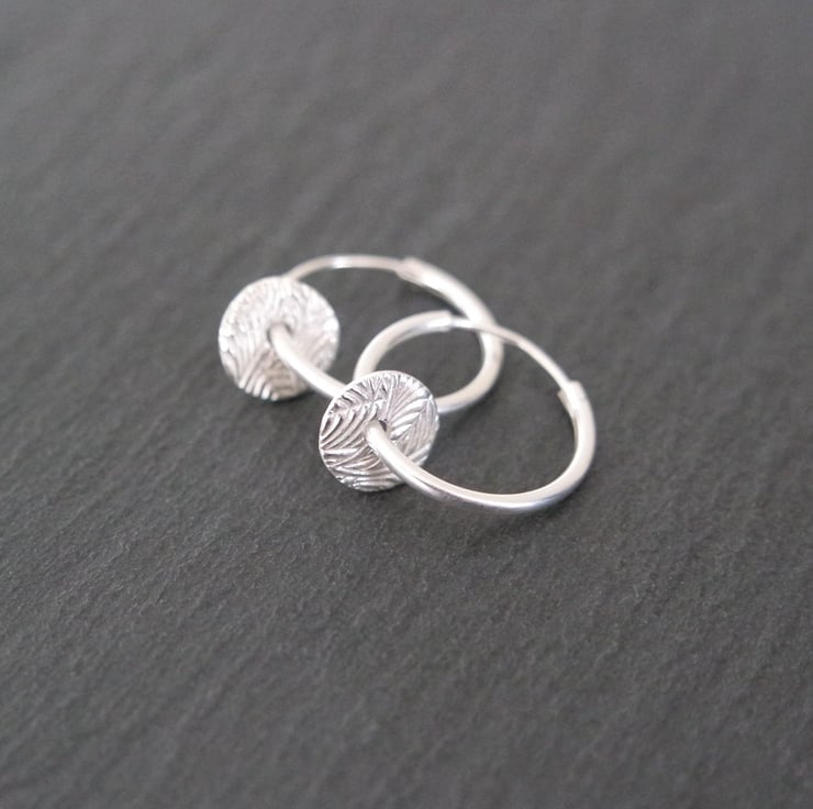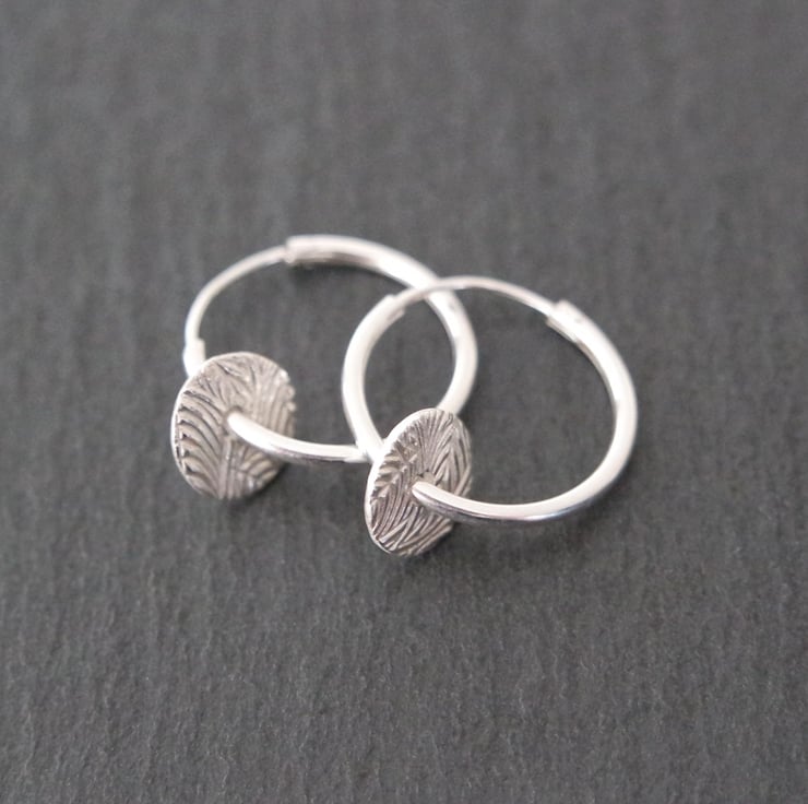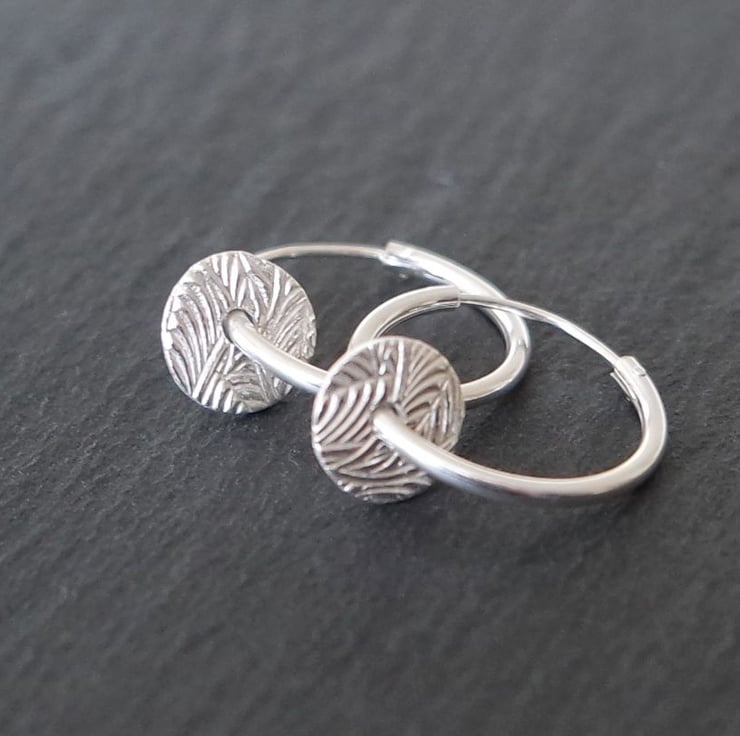 A beautiful pair of small 925 Silver hoops with small abstract leafy patterend charms made with pure silver clay.