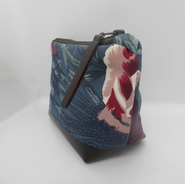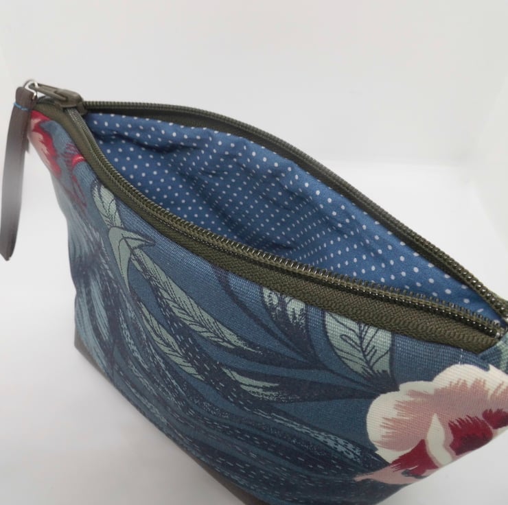 The base is made from dark brown leather and I have boxed the base so that it stands up on it's own. The zip is finished with a leather pull and all topstitching is in blue thread to tie in with the fabric.