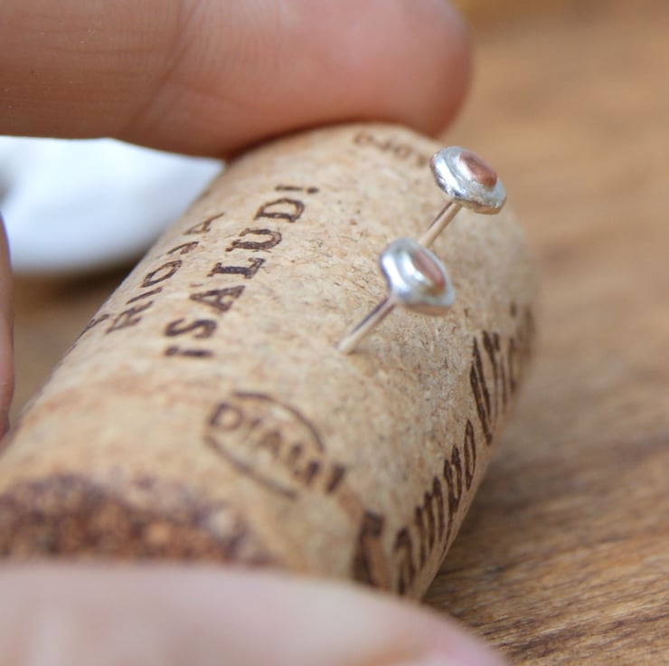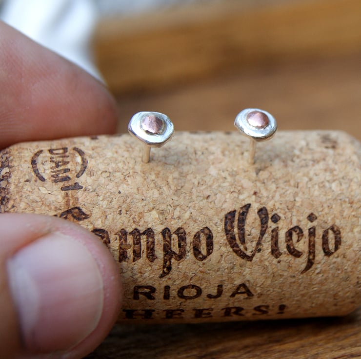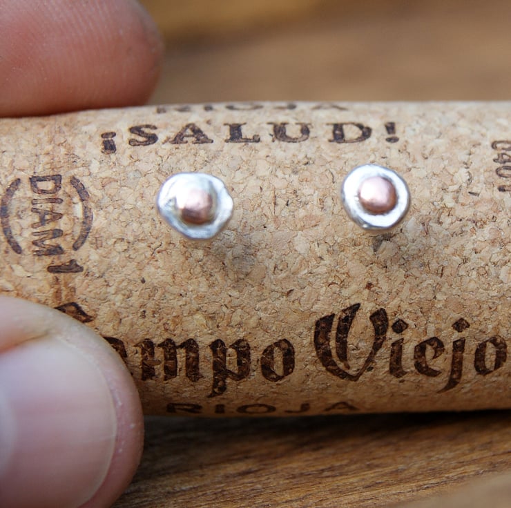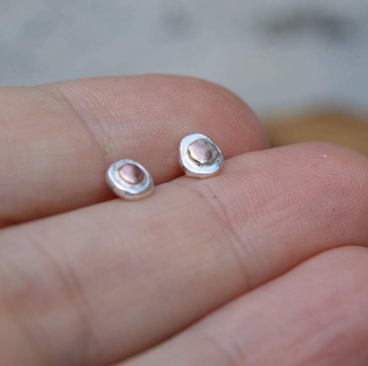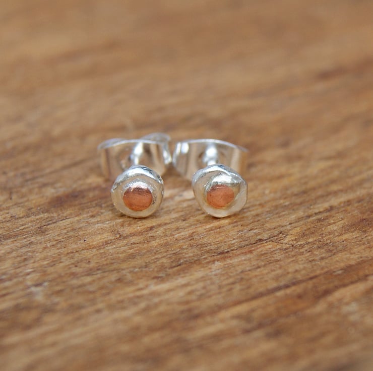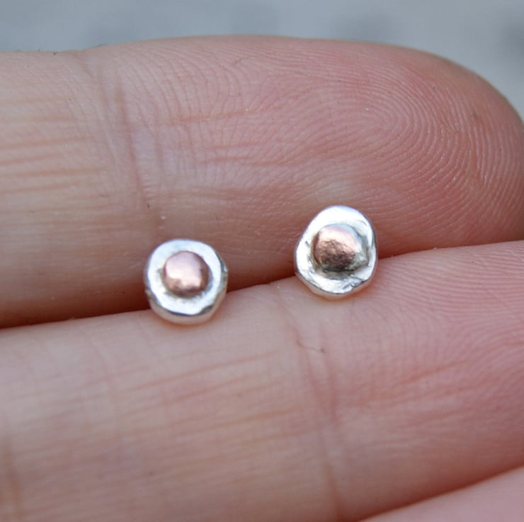 Tiny 4mm round Sterling Silver studs with 2mm copper dot soldered on the top of the silver disc.