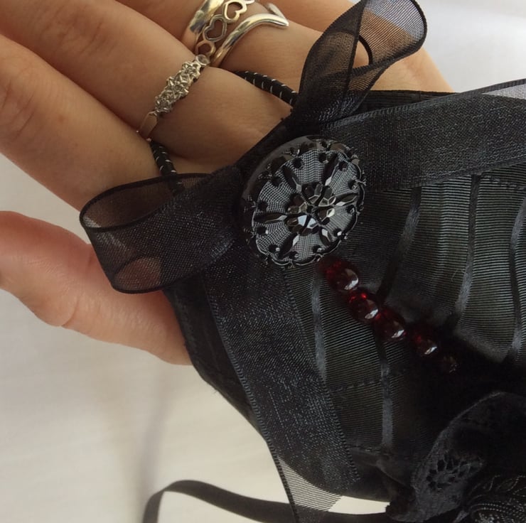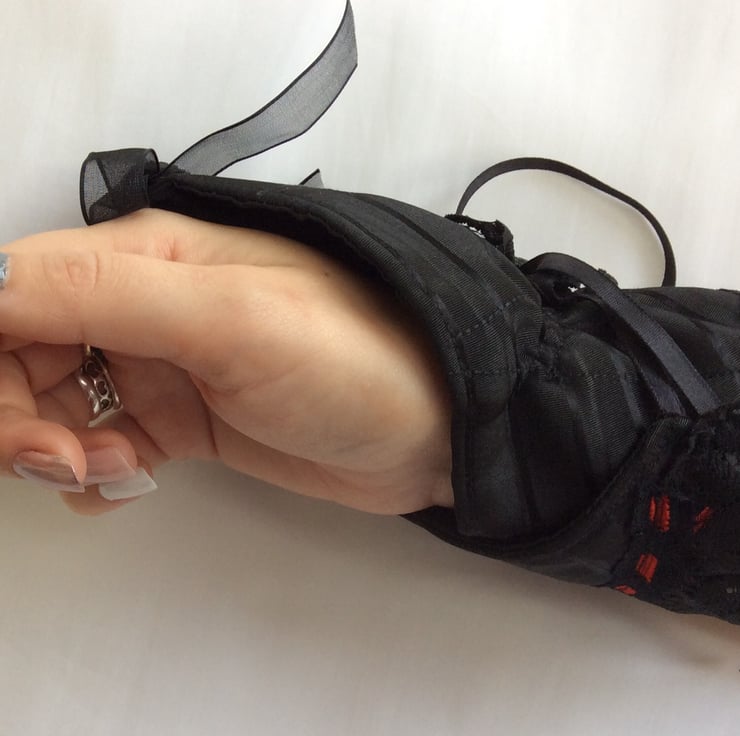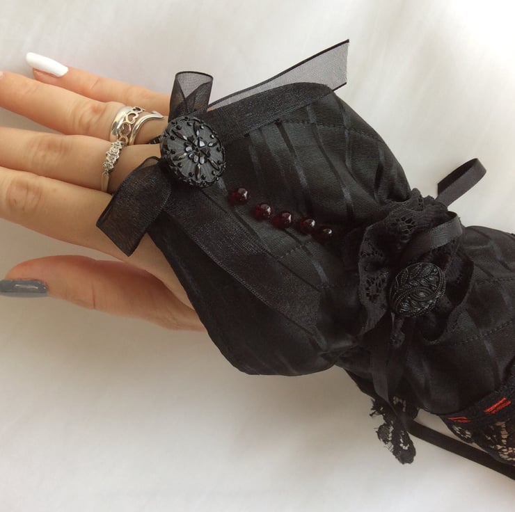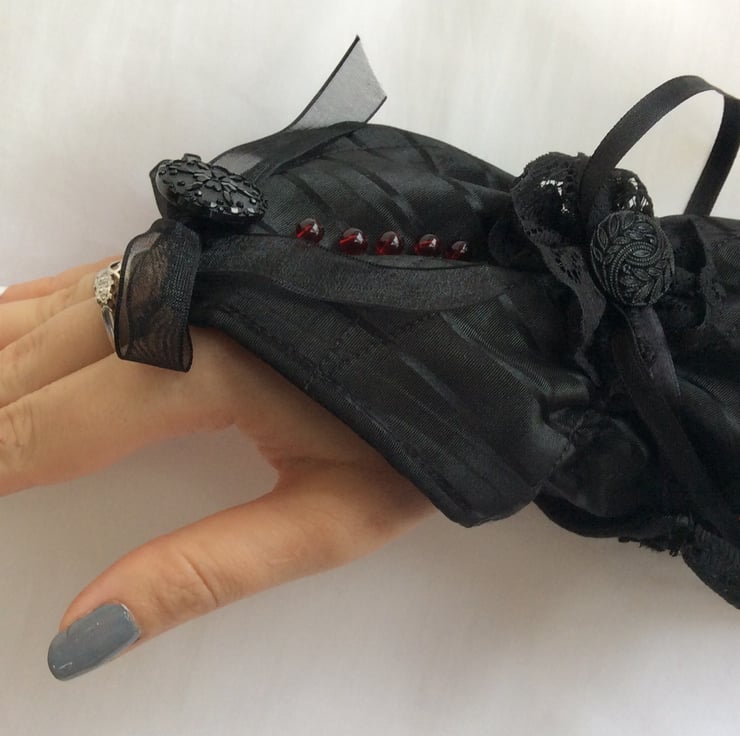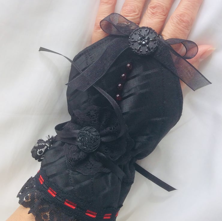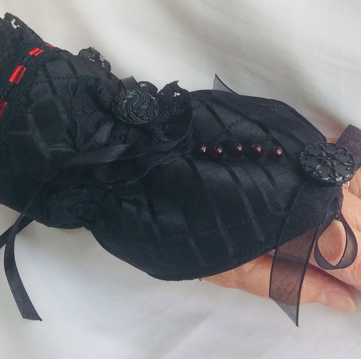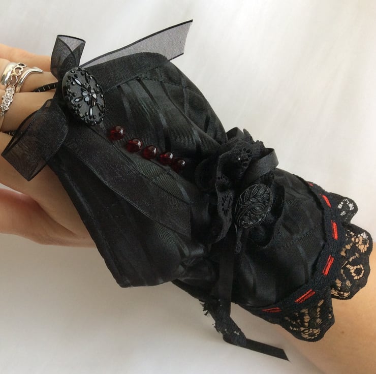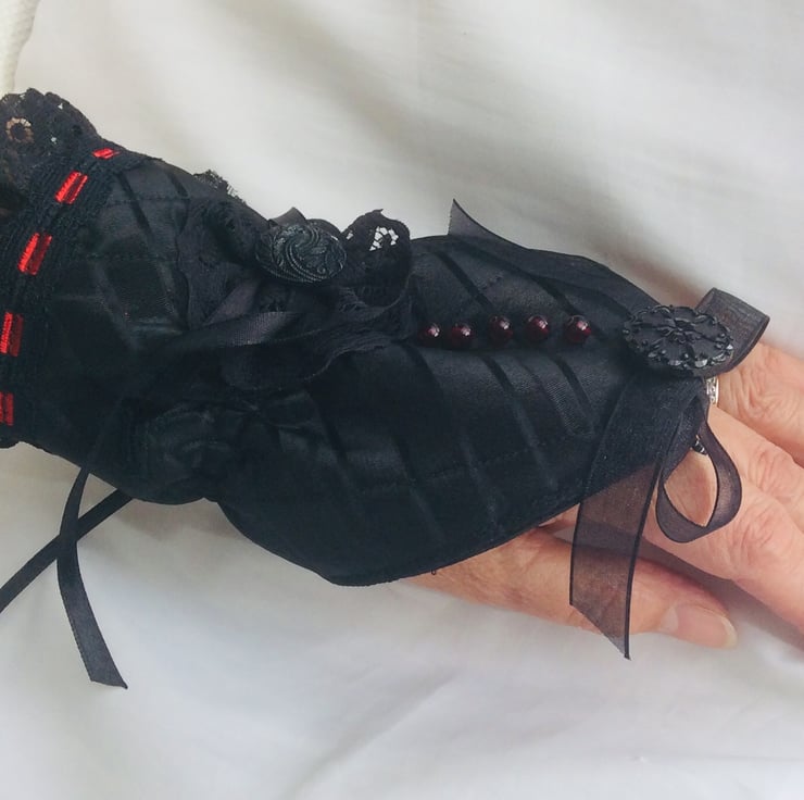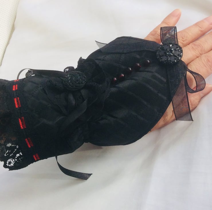 A single, unique, black satin and lace wrist cuff with accents of red. It has an elastic finger loop, black organza bow, black buttons and red beads and can be worn on either wrist.