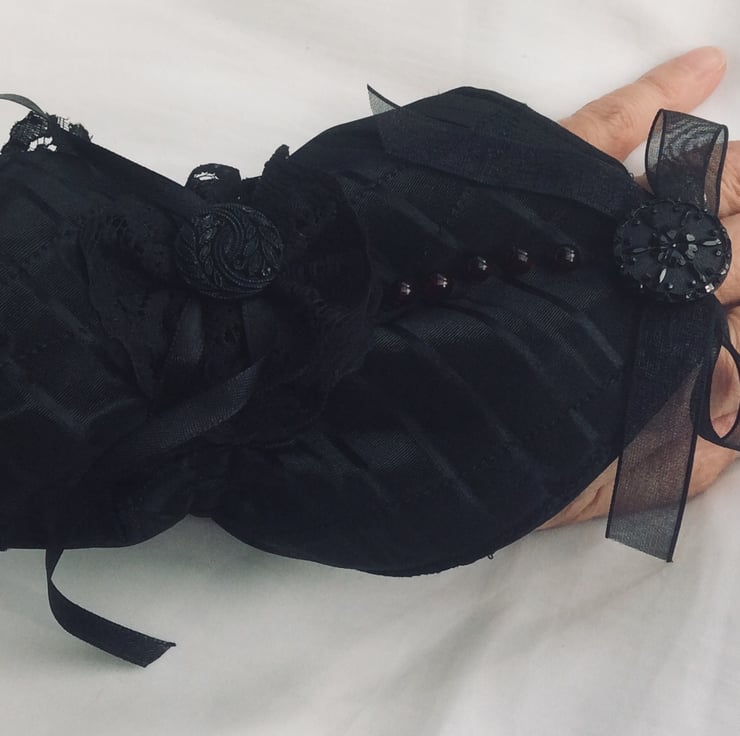 The cuff is lined with black satin and it has a line of elastic to keep it gathered. The cuff is interfaced with felt to add structure.