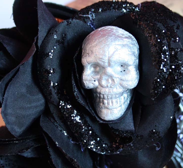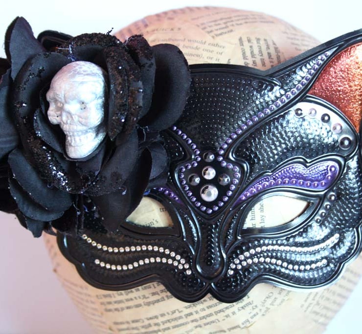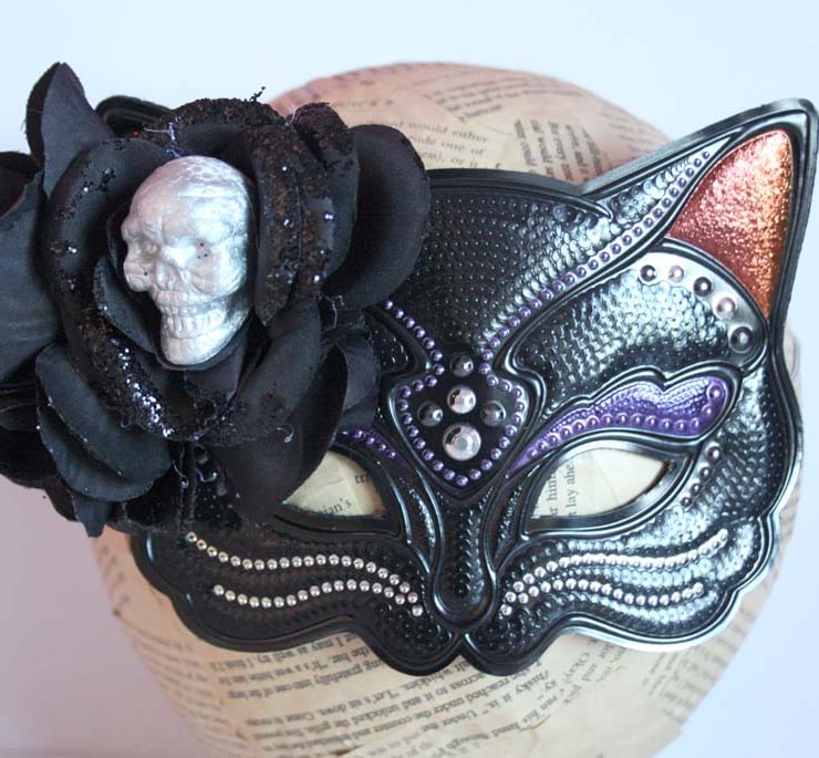Mystical black cat mask made from fabric have been adorned with black fabric roses. A lightweight polystyrene skull sits in the largest flower, which has also been embellished with black glitter.