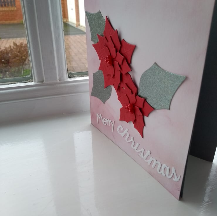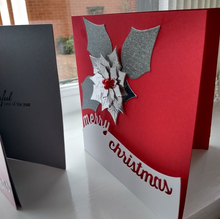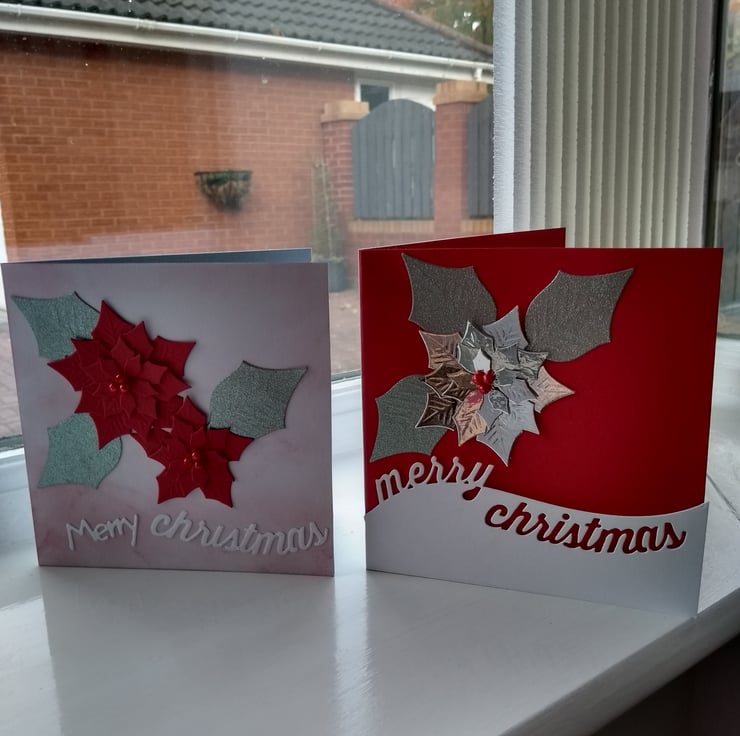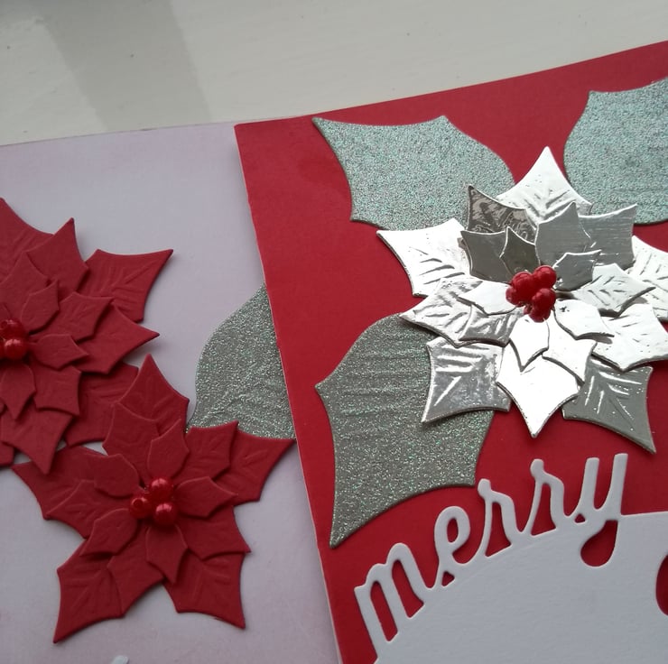 A completely handmade and uniquely designed packing f 2 cards. Both featuring poinsettia die cut from quality card. One silver mirri on red and the other red on white. Merry Christmas greeting on front and finished off with red beads berries hand in the centre of each flower.