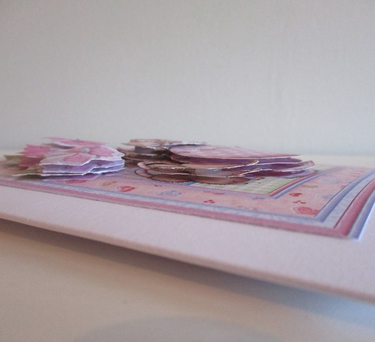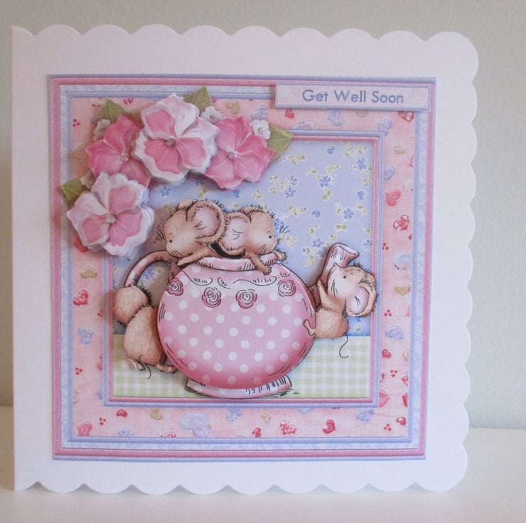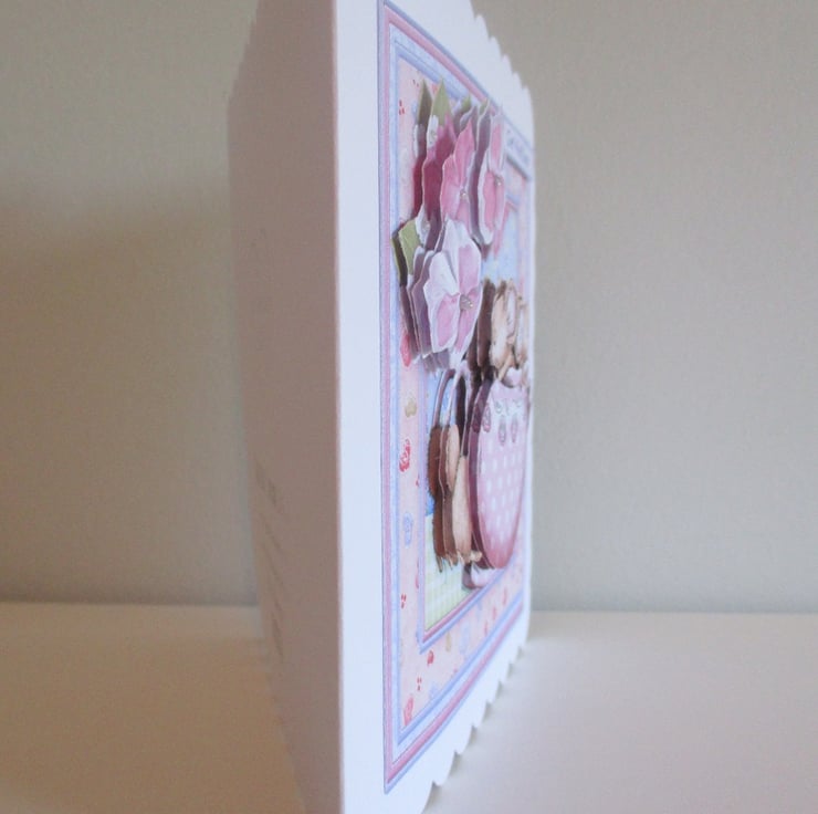 A white square scalloped edge card measuring 145x145mm(5.75x5.75in) has a decoupage/3D effect design of a teapot with cute mice