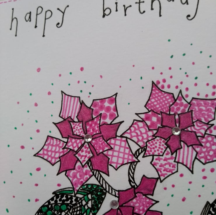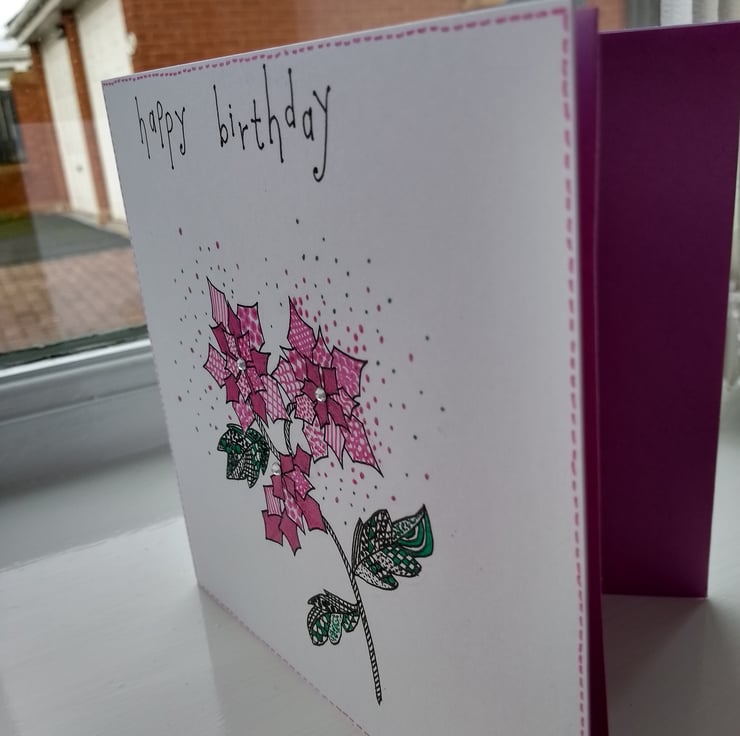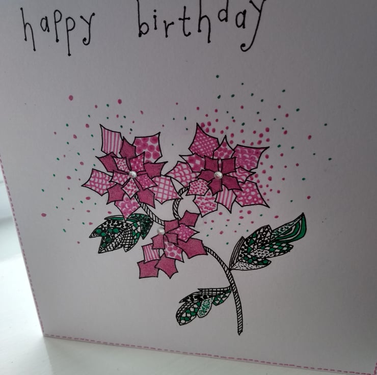 A completely handmade and uniquely designed card. Consisting of a poinsettia hand drawn in black ink. Coloured in with glitter gel pen. Finished off with hand written happy birthday in black ink and silver rhinestones
