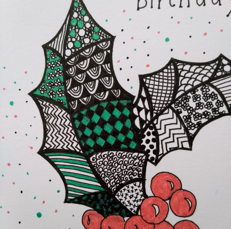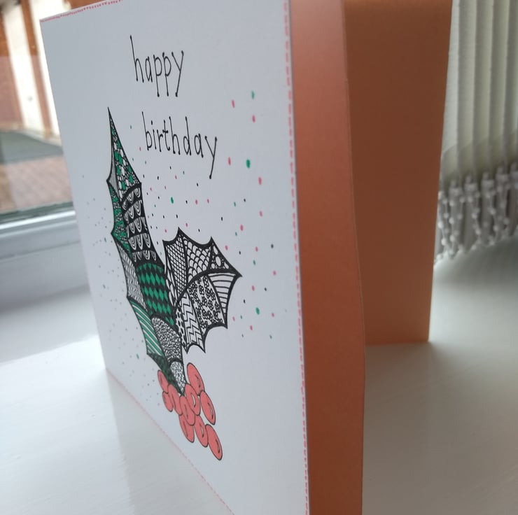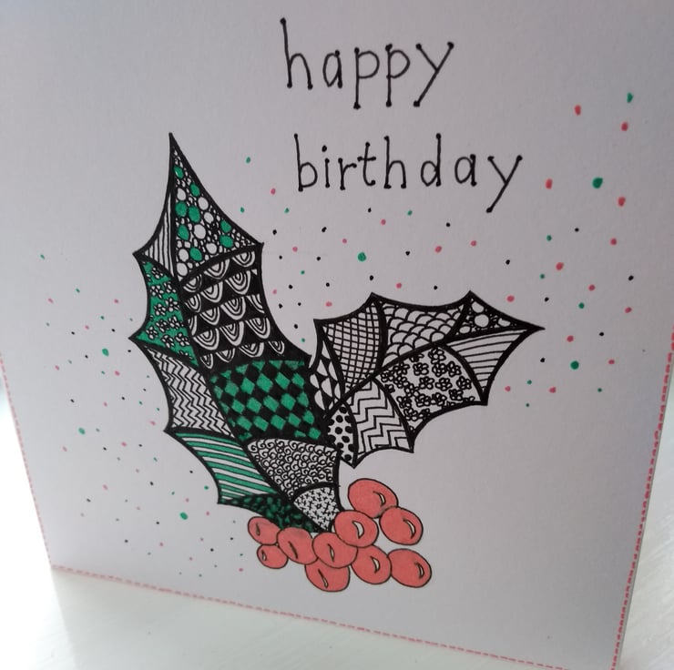 A completely handmade and uniquely designed card. Consisting of Holly leaves and berries hand drawn in black ink onto quality pristine white card. Hand coloured with glitter gel pen. Finished off with happy birthday hand written in black ink