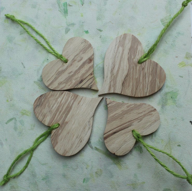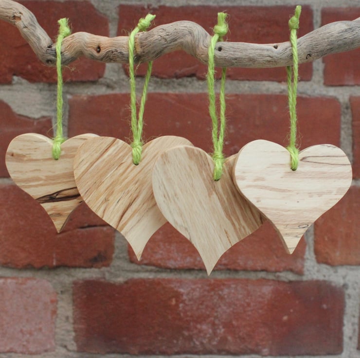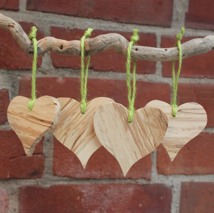 I have hand cut each of these hearts from a piece of 8mm spalted beech. They have been sanded and waxed and finished with a green twine loop. Two are 7cm x 7cm and two are 6.5cm x 6cm. I think that they would look lovely hung on a Christmas tree! Pack of 4.