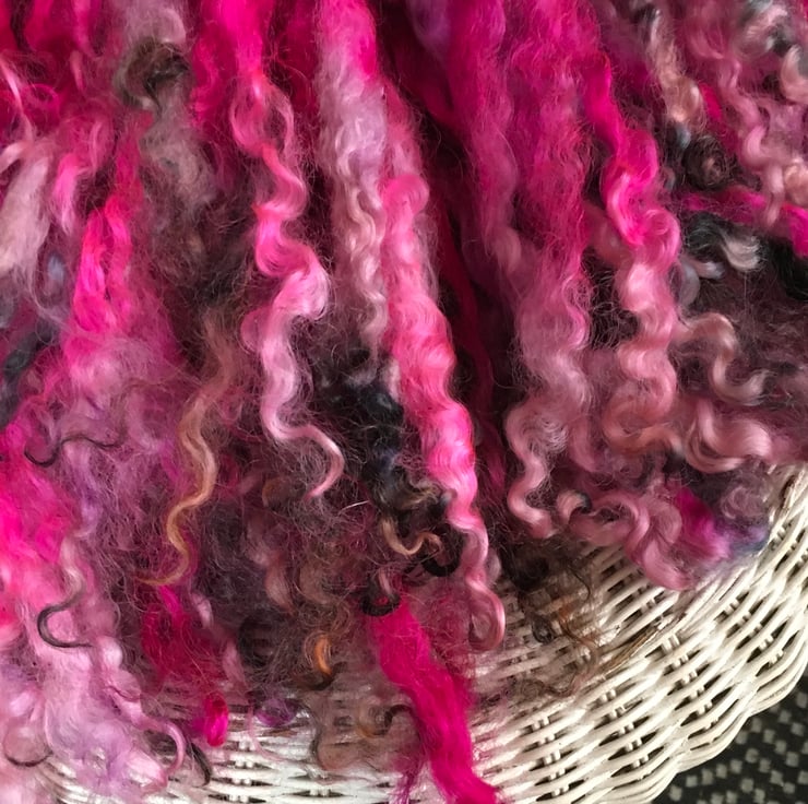 These are very soft British Leicestershire sheep locks, that I have hand sorted, hand washed and hand dyed with eco-friendly dyes in shades of pinks,purples and black.