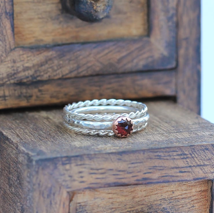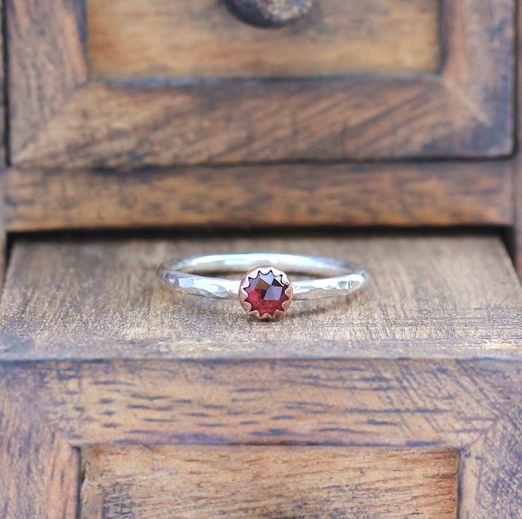 A vibrant red garnet gemstone set in a handcrafted sterling silver and copper stacking ring. This unusual and striking ring is durable and suitable to wear every day!
