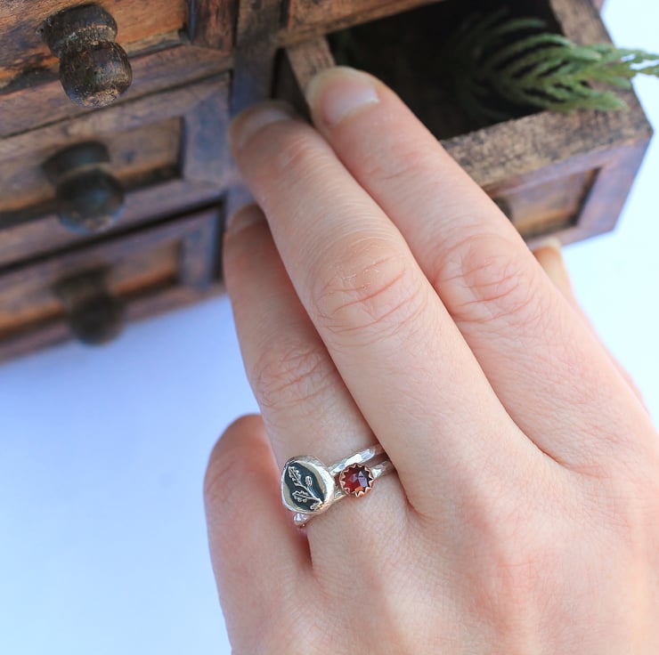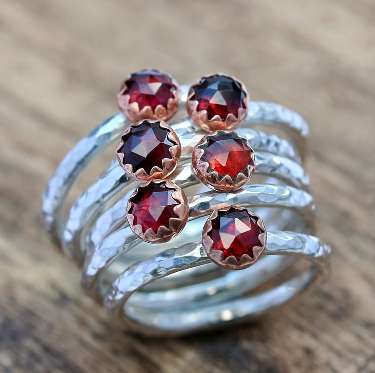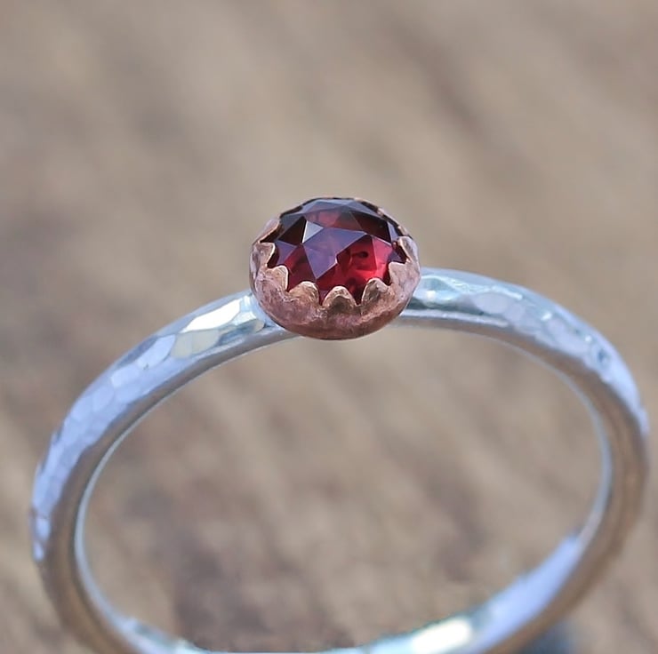 This ring features a ruby-red 5mm rose-cut garnet stone. The silver band is hammered to add texture and then tumble polished to a bright shine finish.