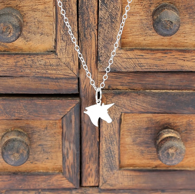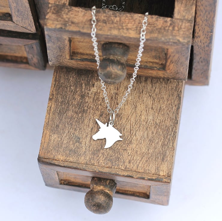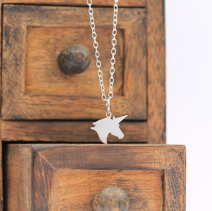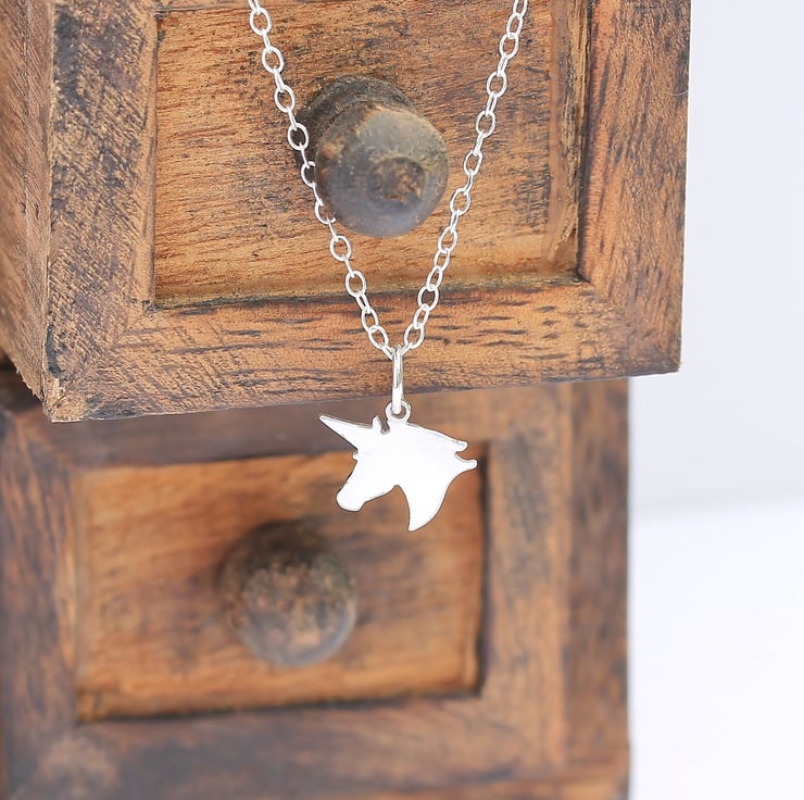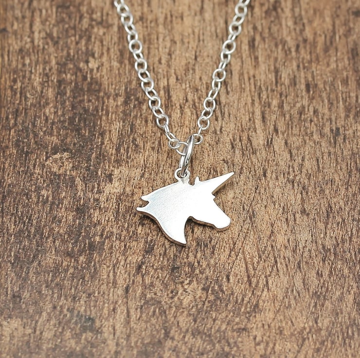 A cute, little sterling silver unicorn pendant. The unicorn silhouette is hand-cut from a single solid piece of sterling silver and given a polished finish.