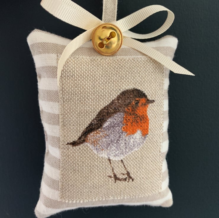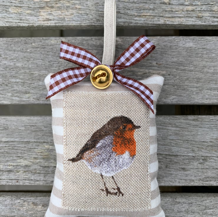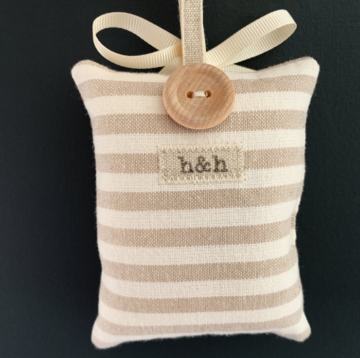 Made from taupe and white striped woven cotton, the robin decorations are filled with toy-grade stuffing and whole cloves for a gorgeous Christmas spice aroma. There is a linen 'h&h' label on the back as well as a rustic wooden button and the decorations are finished with a gold jingle bell, a linen hanging loop and a choice of either a cream grosgrain ribbon bow or a chocolate-brown and white gingham ribbon bow.