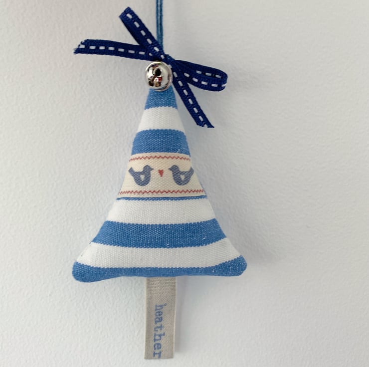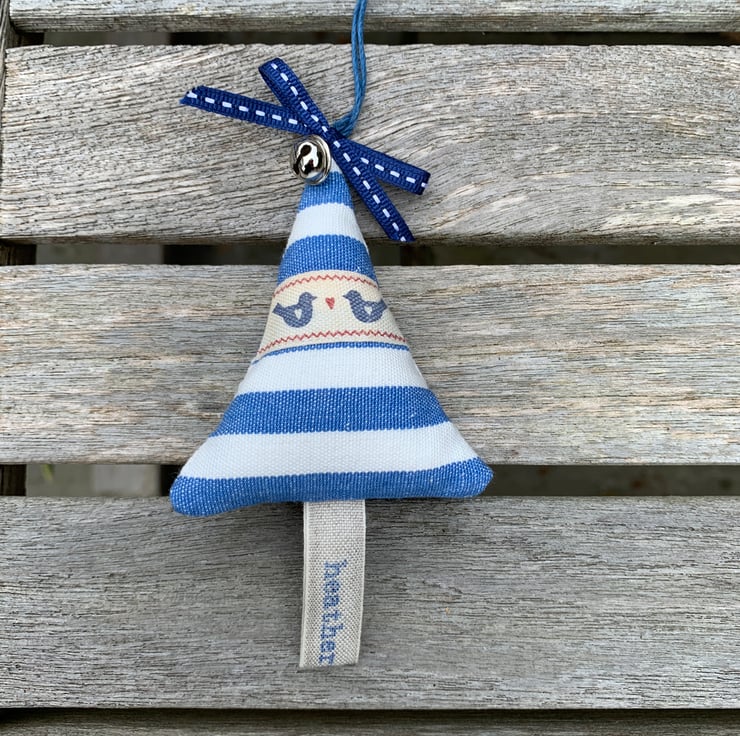 Blue and white stripey tree padded with toy-grade stuffing and whole cloves for a warm and spicy Christmas aroma. Blue bird and red heart ribbon detail, topped with silver jingle bell and blue/silver ribbon bow, 'heatherandhome' linen ribbon trunk.