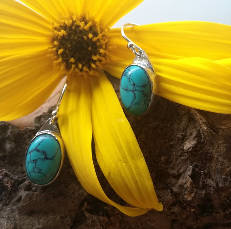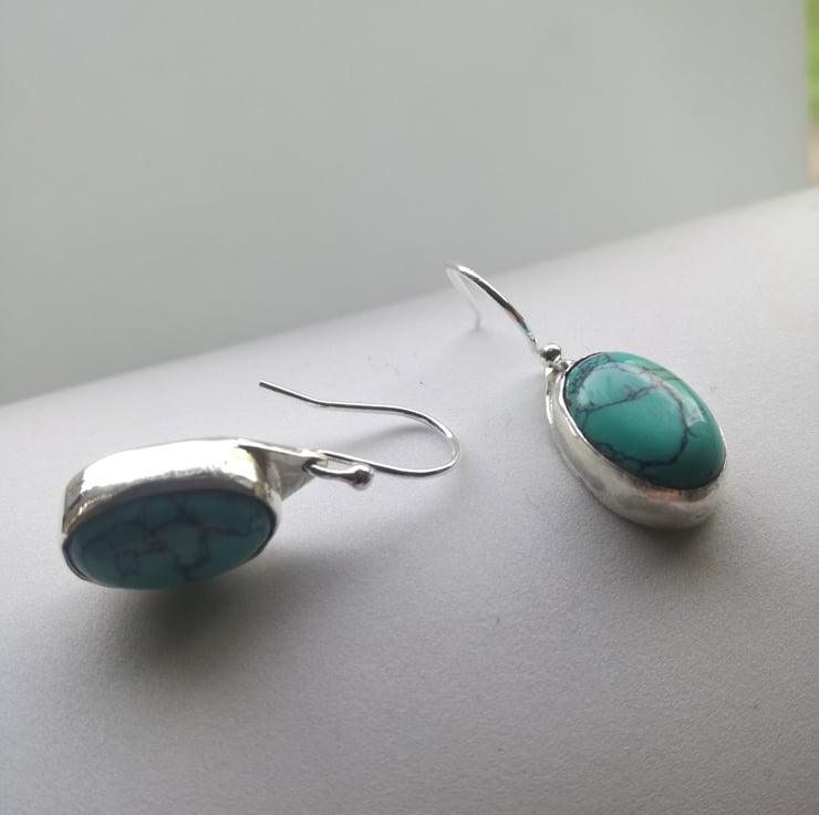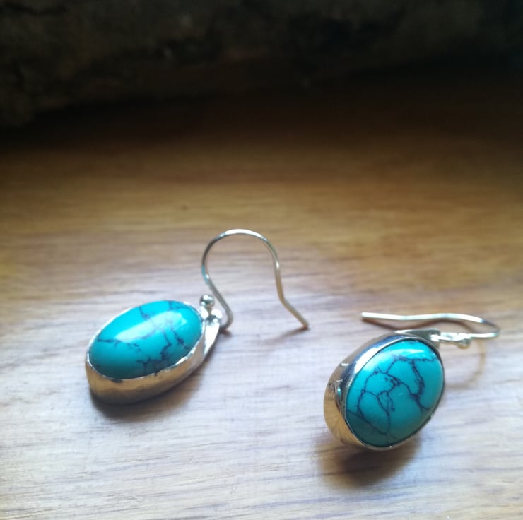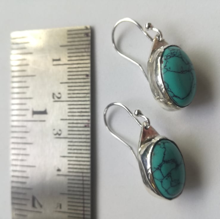 These earrings are made with beautiful turquoise cabouchons set into sterling silver. I kept the setting simple as the turquoise stones are unusually attractive in my opinion.