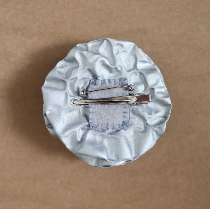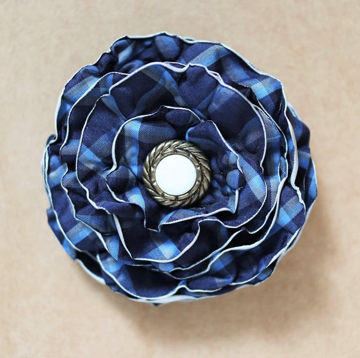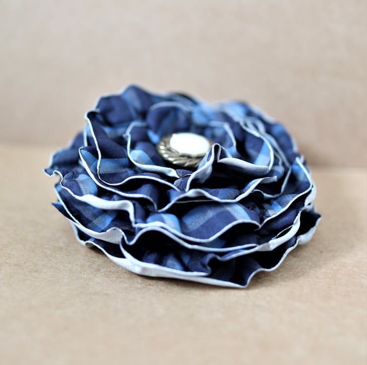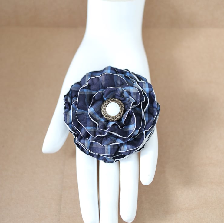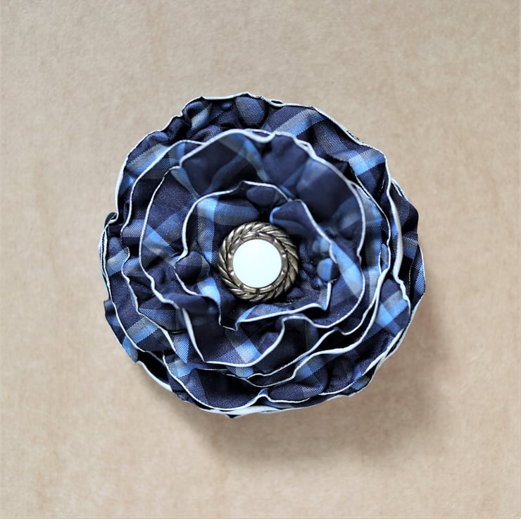Up-cycled navy checkered textile floral design brooch - hair clip