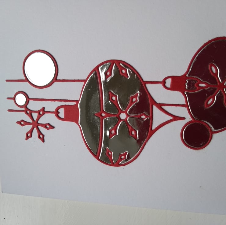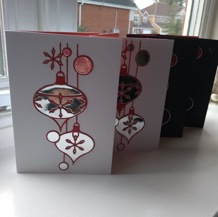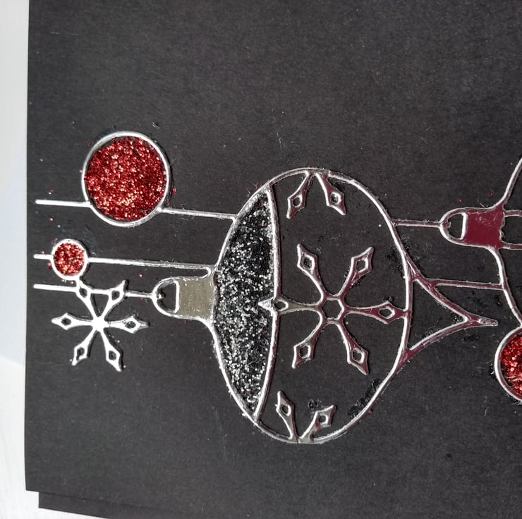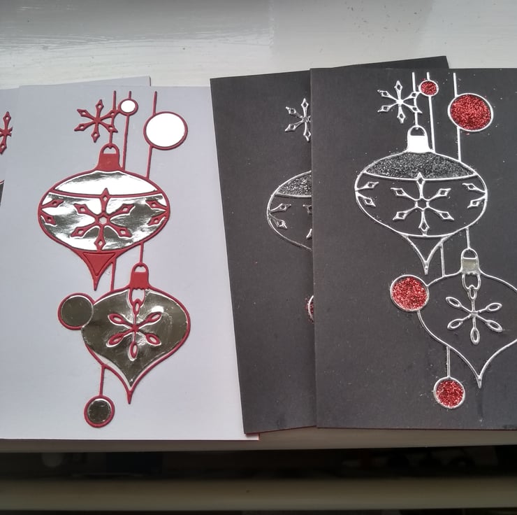 A completely handmade and uniquely designed pack of 4 cards. Same design in two colourways. Die cut baubles one set filled in with silver mirri card and the other with red and silver glitter. Mounted onto white/ black card.
