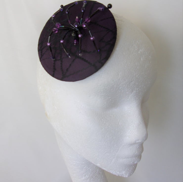 Created with a round felt base which is covered a beautiful aubergine satin fabric then covered again with a beautiful soft black cobweb tulle fabric with a black circle of felt underneath with a metal croc clip for fixing.