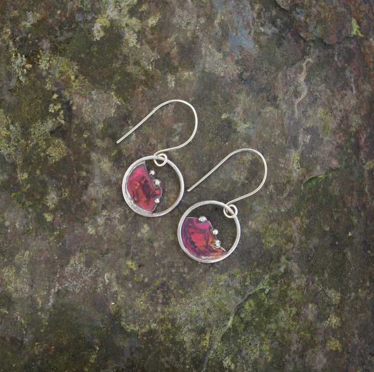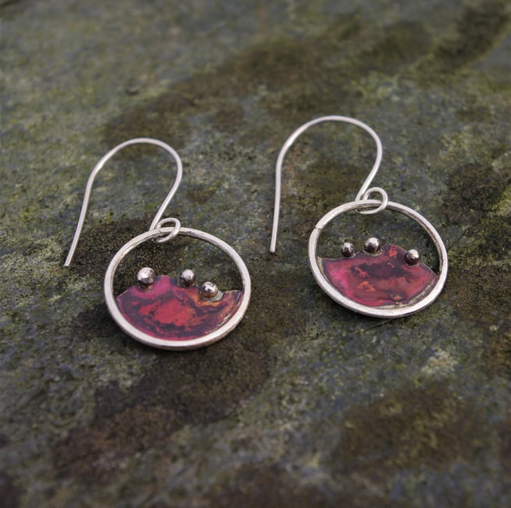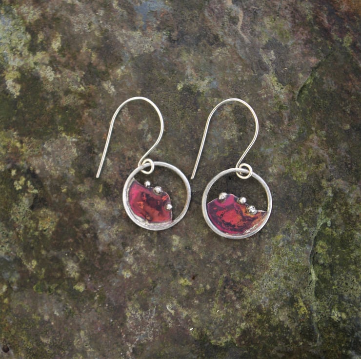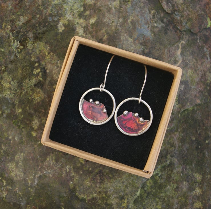 I have made a circular silver and copper earrings inspired by the hills outside my window . The round granules of silver, reminiscent of the bushes dotted along the tops of the hills . The luscious copper and red tones on the copper are achieved with the application of heat ; each time a unique colour will appear; making the process unpredictable and exciting .